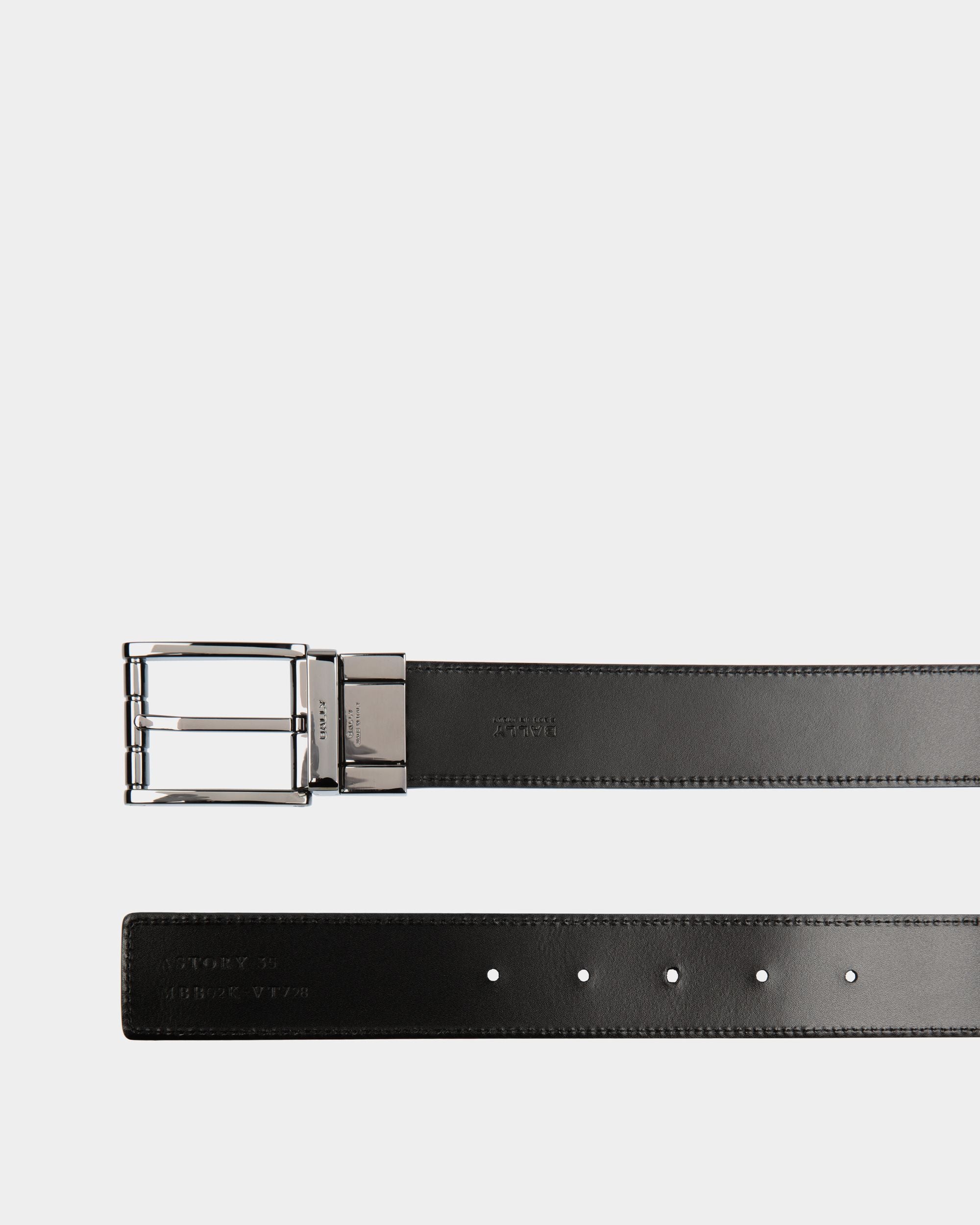 Adjustable and reversible, the Astory 35mm belt is crafted from black calfskin. The clean lines of the ruthenium-hue metal buckle ensure its versatility.
