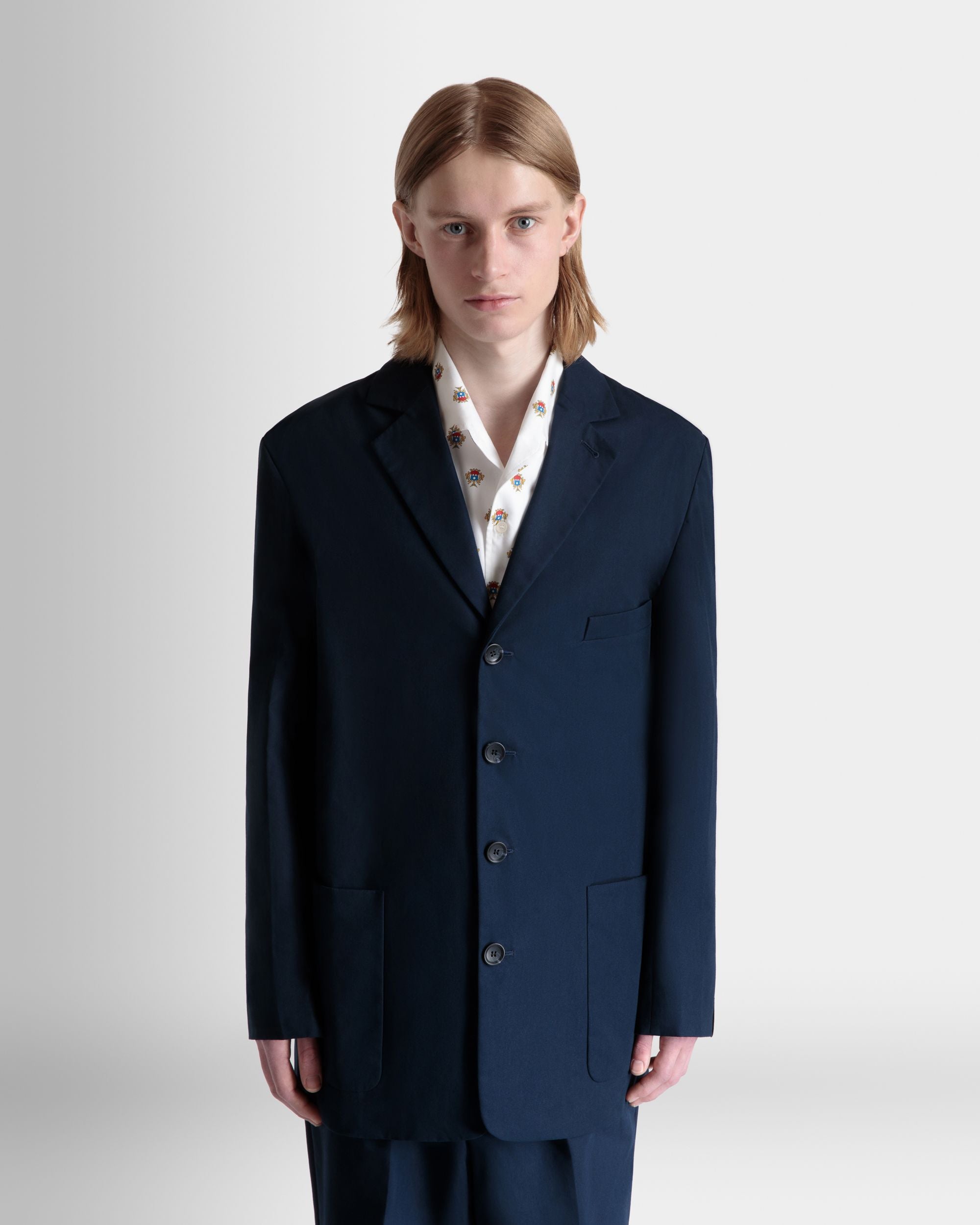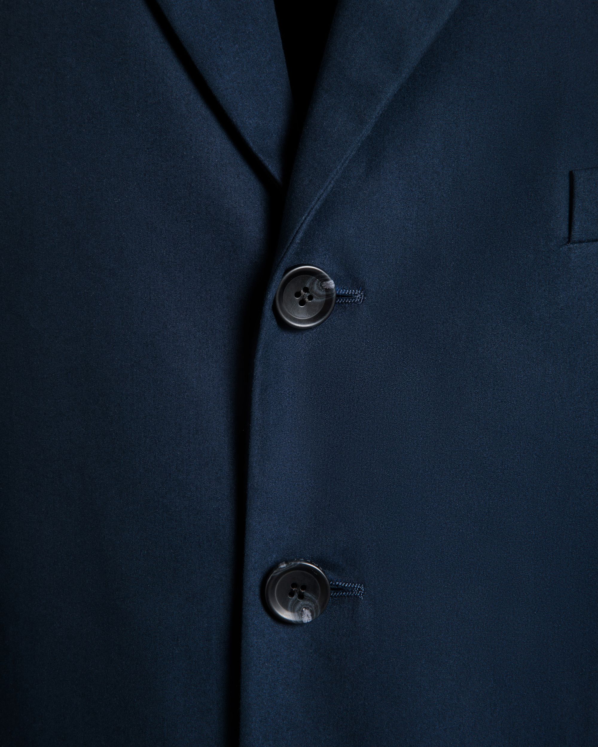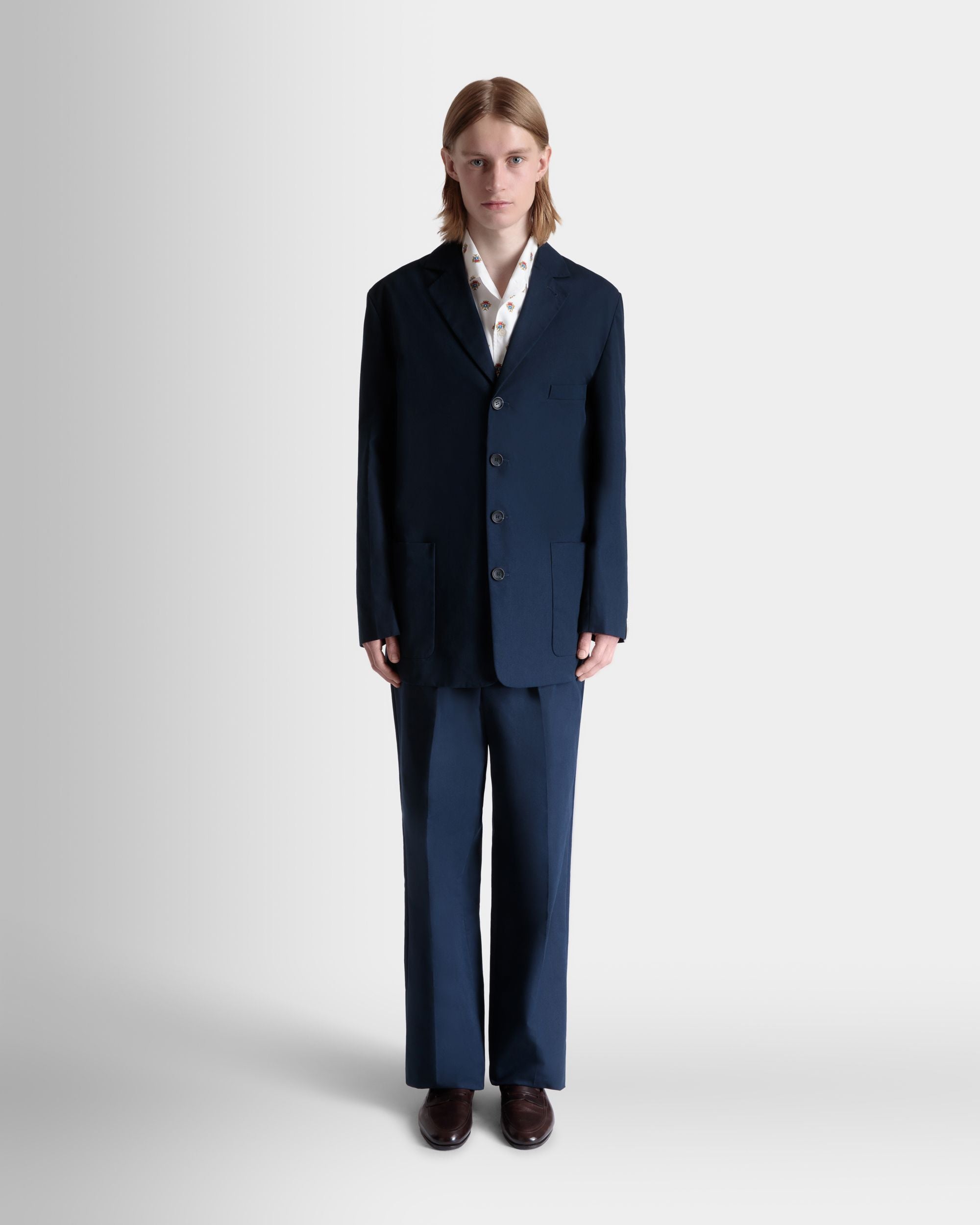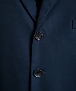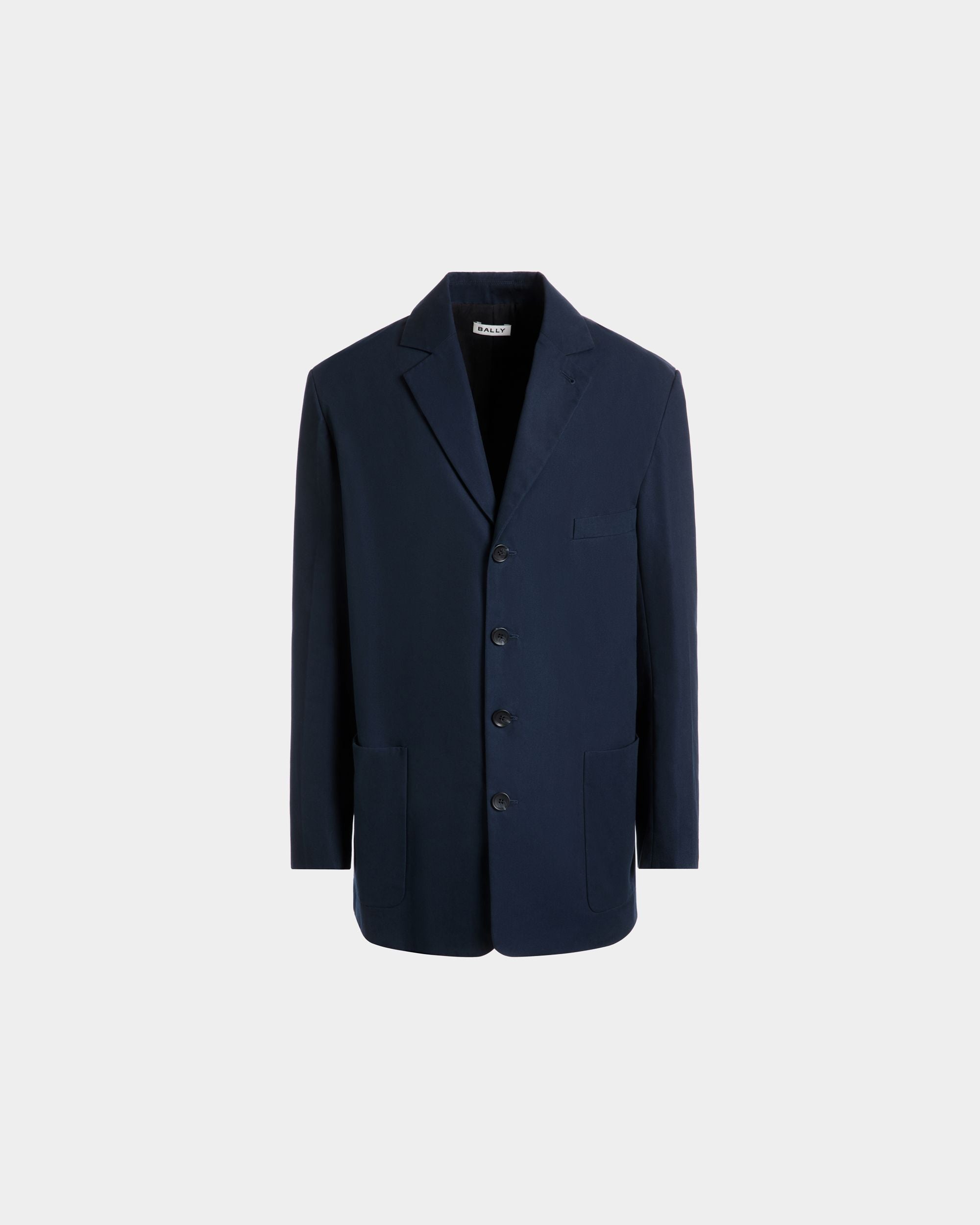 Navy blue notch-lapel blazer in cotton blend fabric with four horn-effect buttons, a half-welt chest pocket, and two patch pockets at the front.