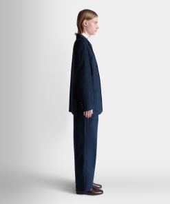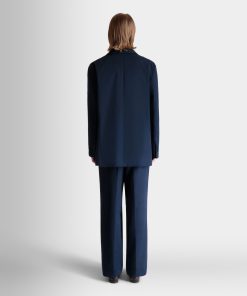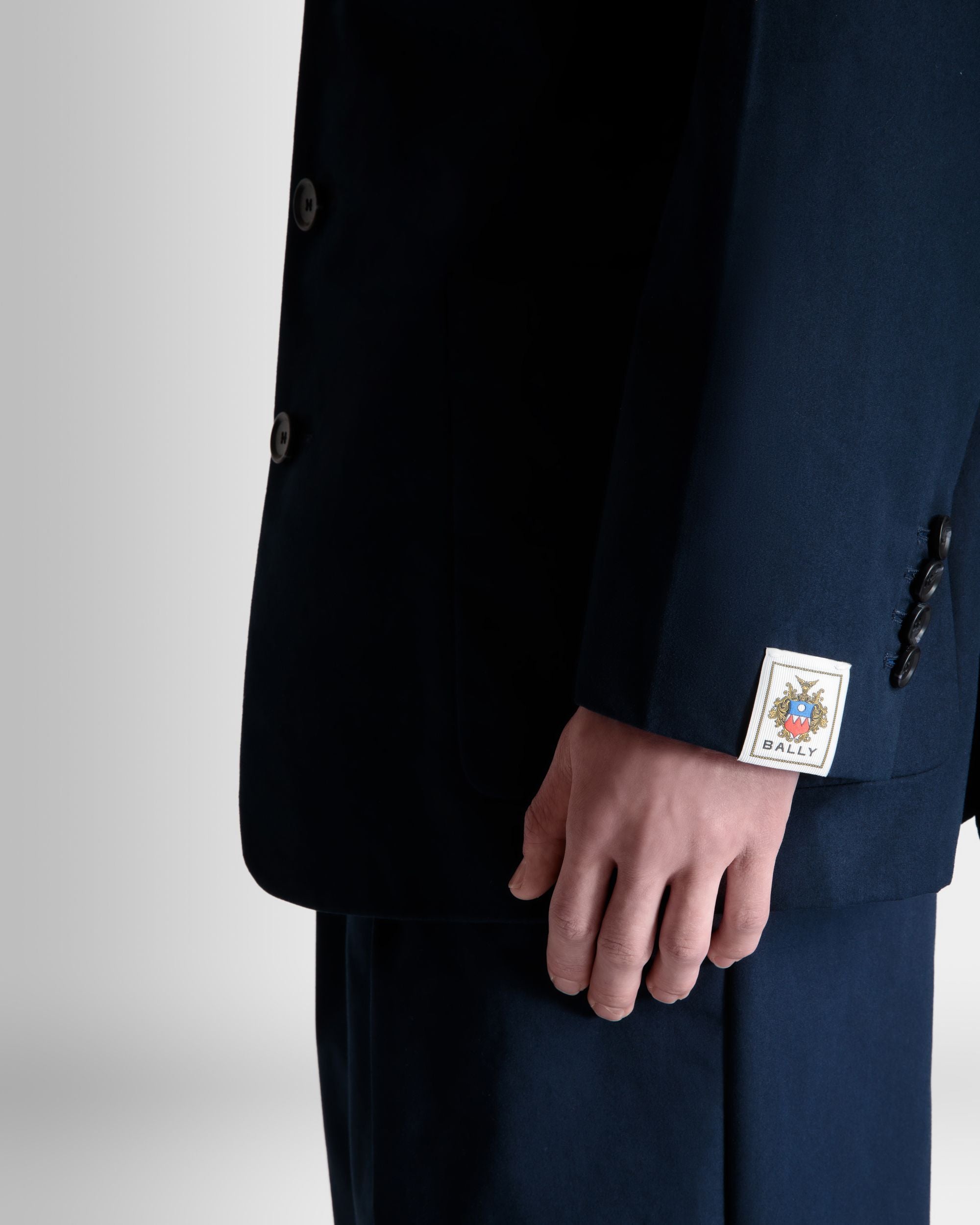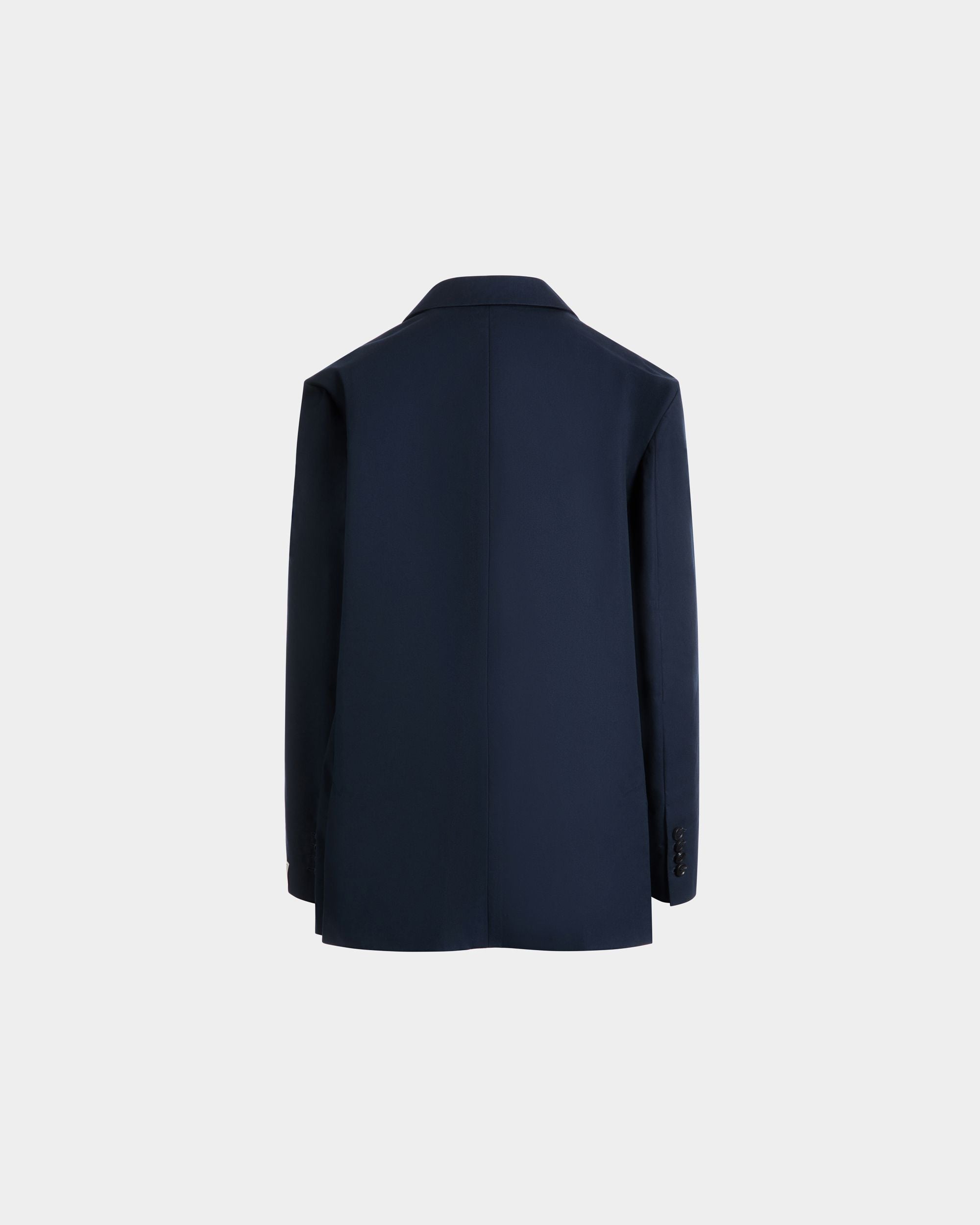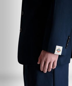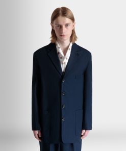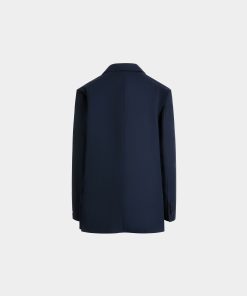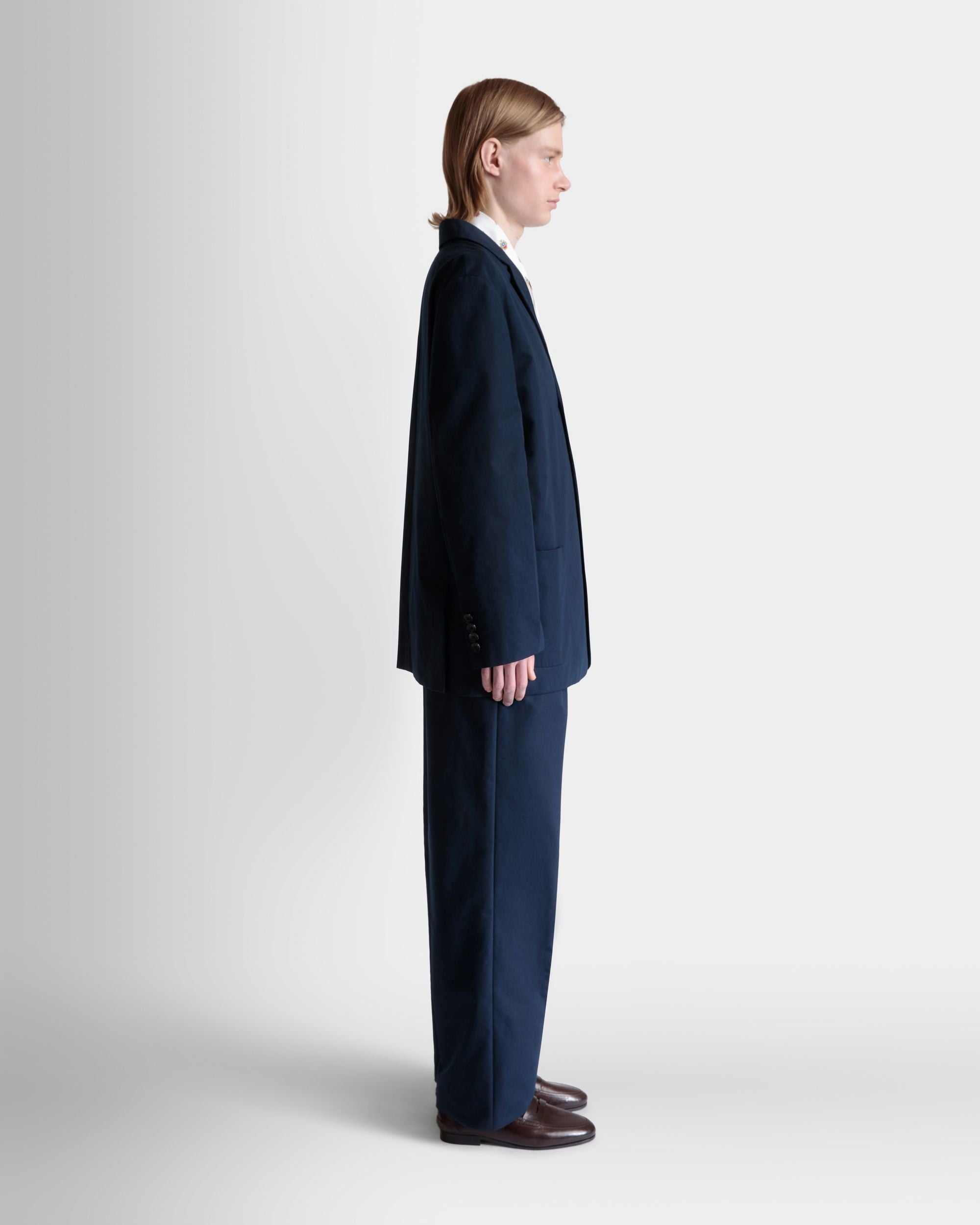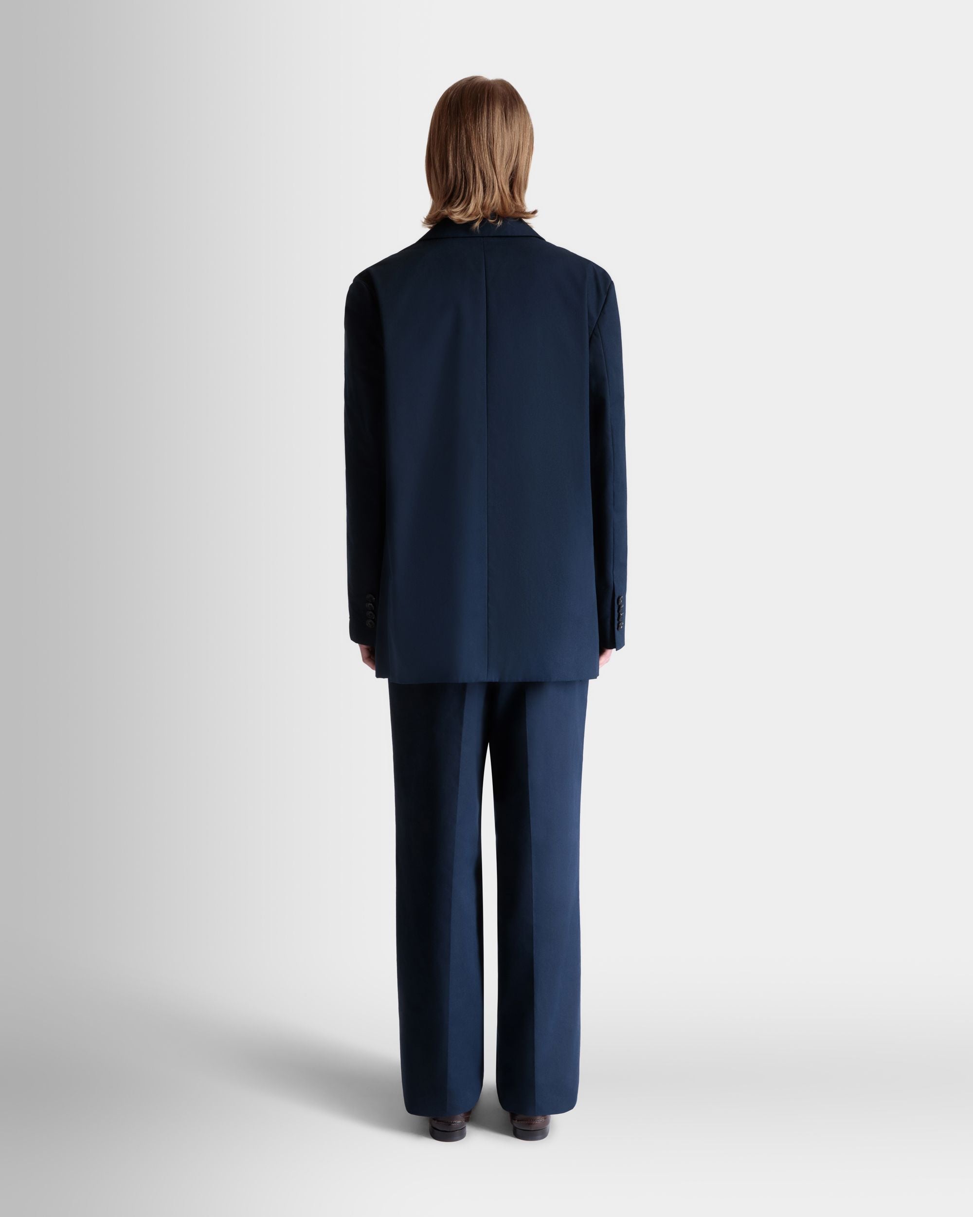 Navy blue notch-lapel blazer in cotton blend fabric with four horn-effect buttons, a half-welt chest pocket, and two patch pockets at the front.
