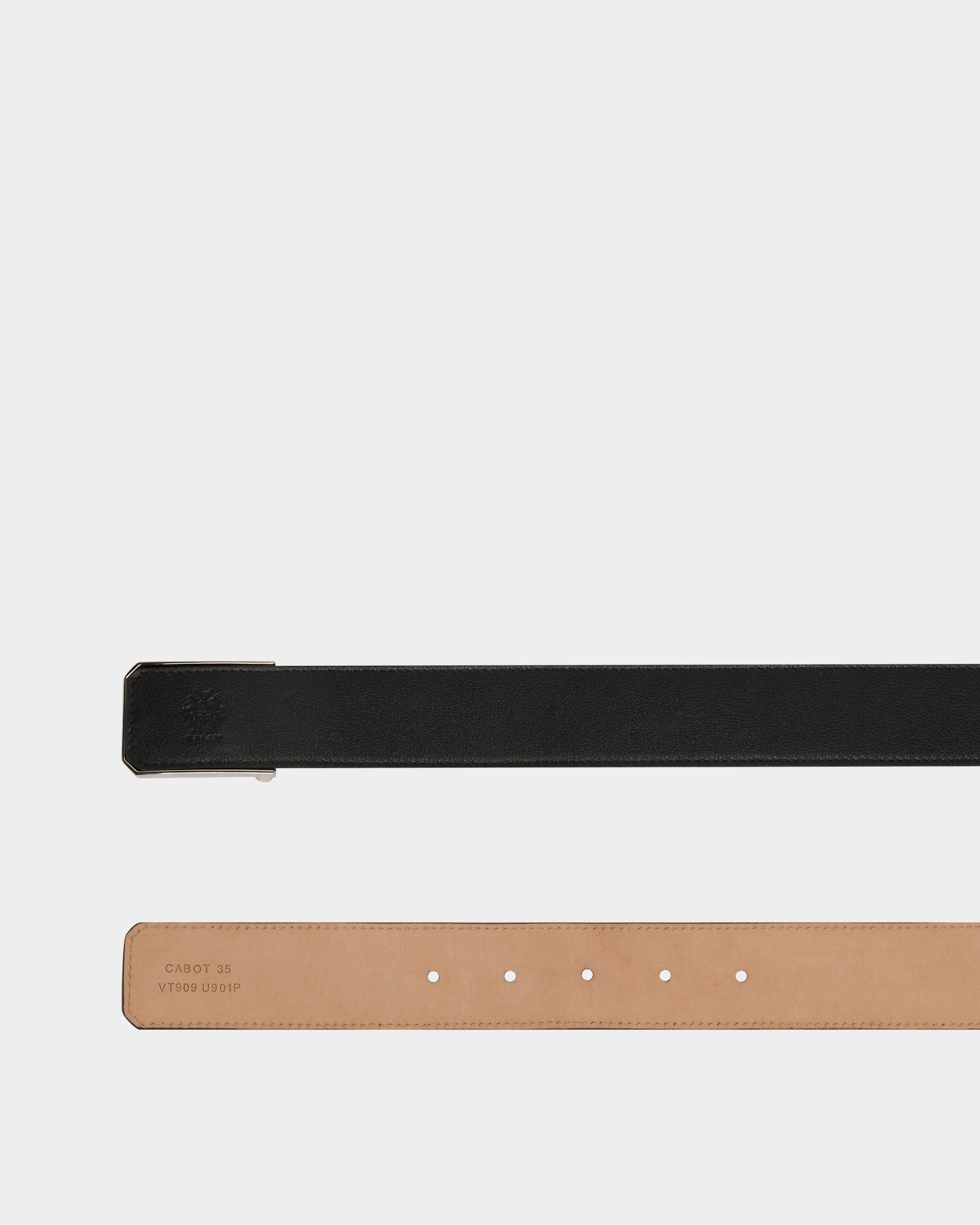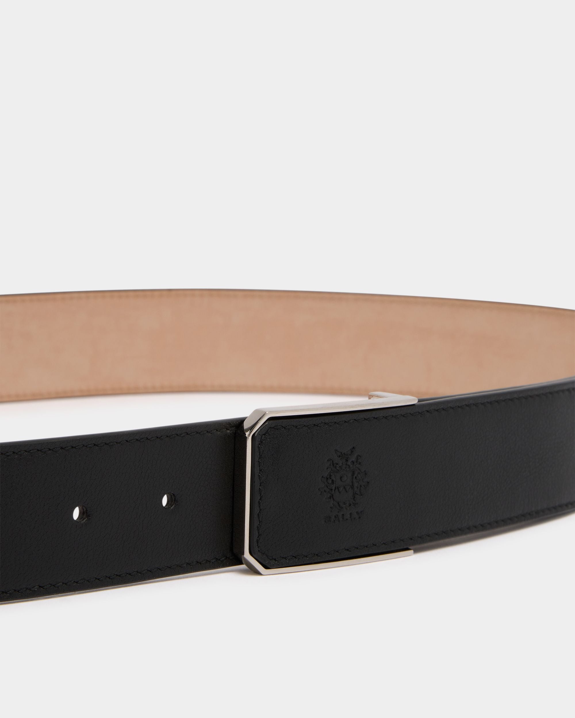 An iconic Bally Crest is engraved on the rectangular ruthenium-hue metal buckle of this adjustable and reversible 35 mm belt in black leather.