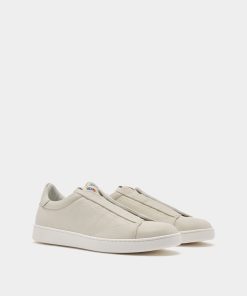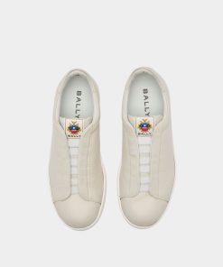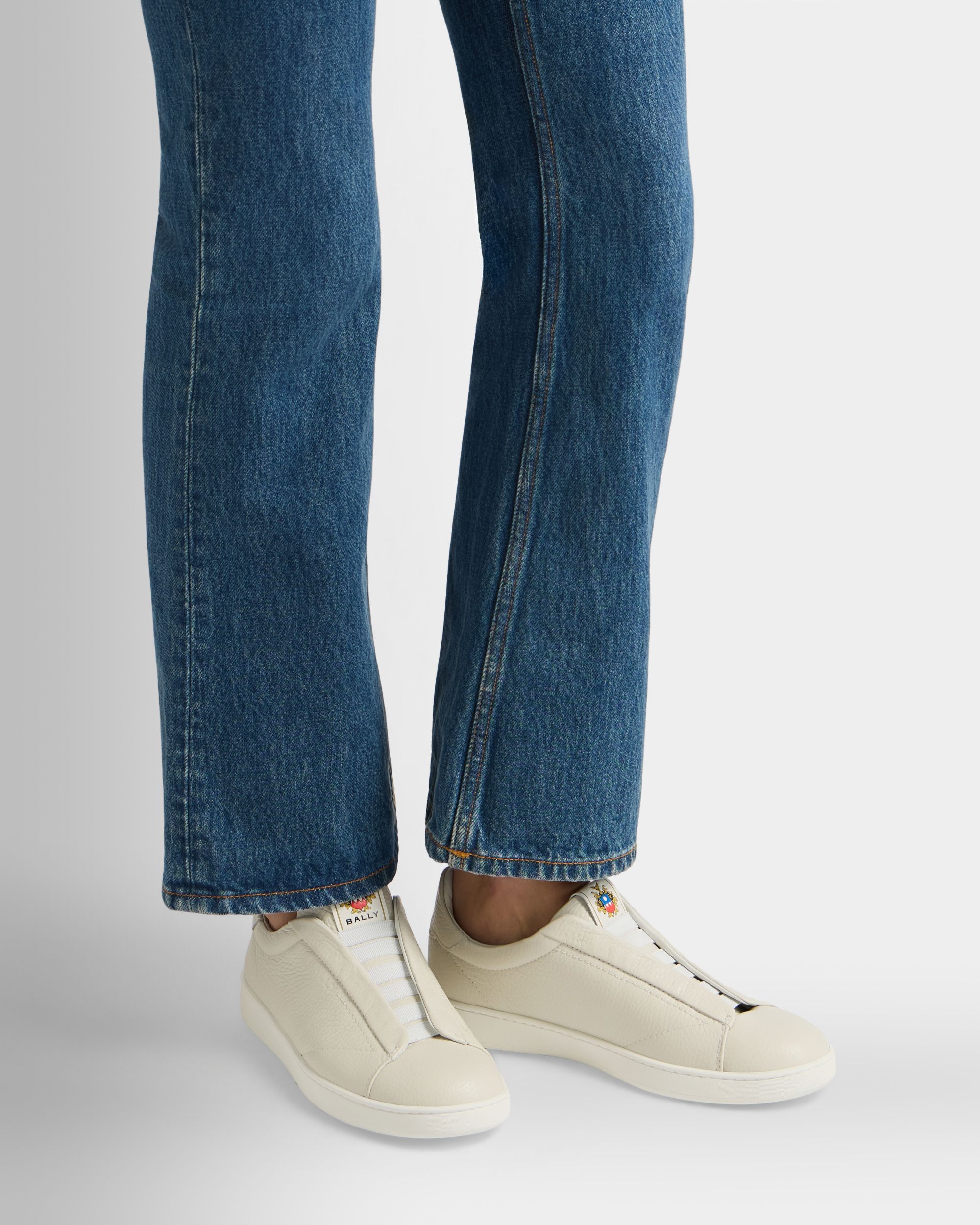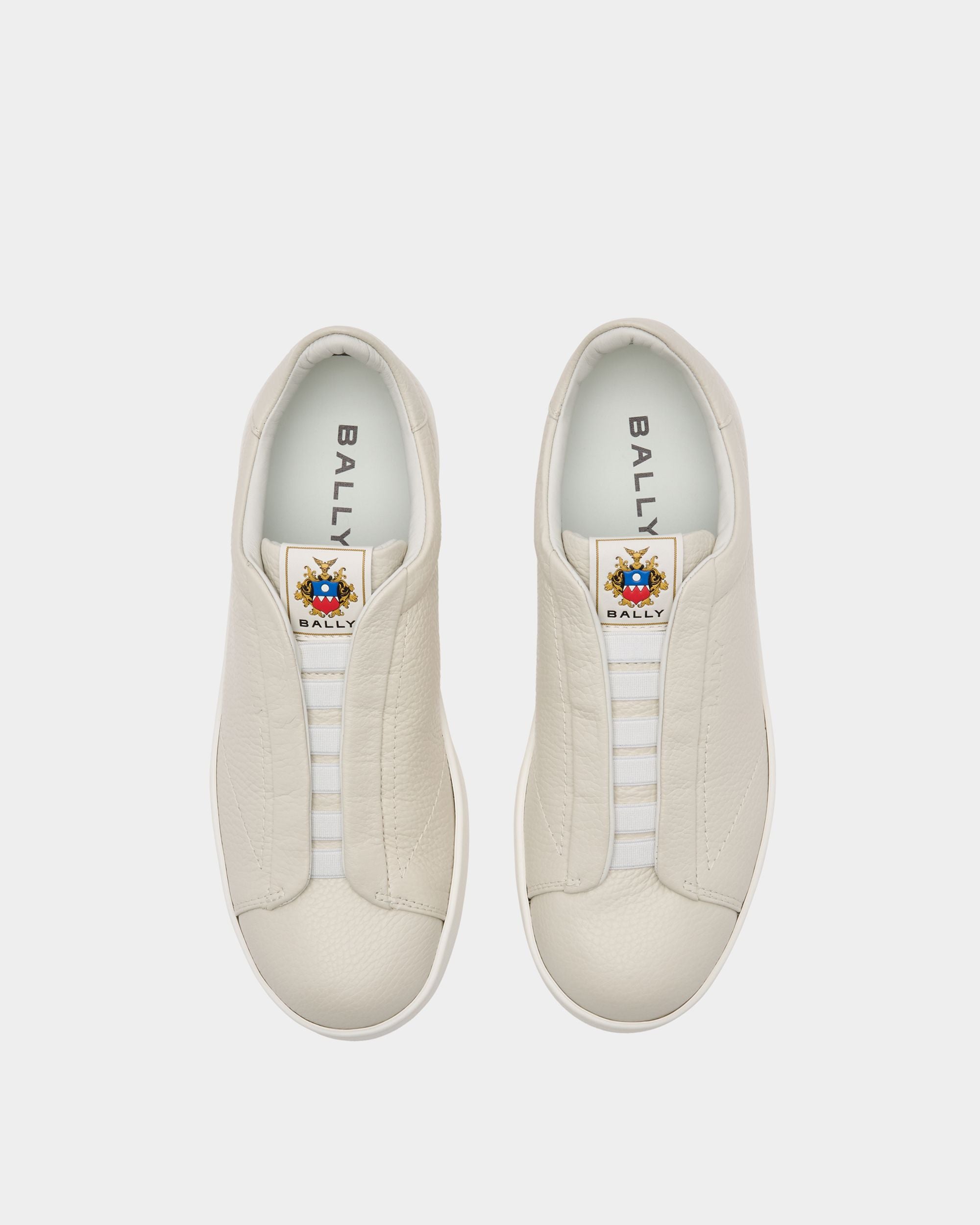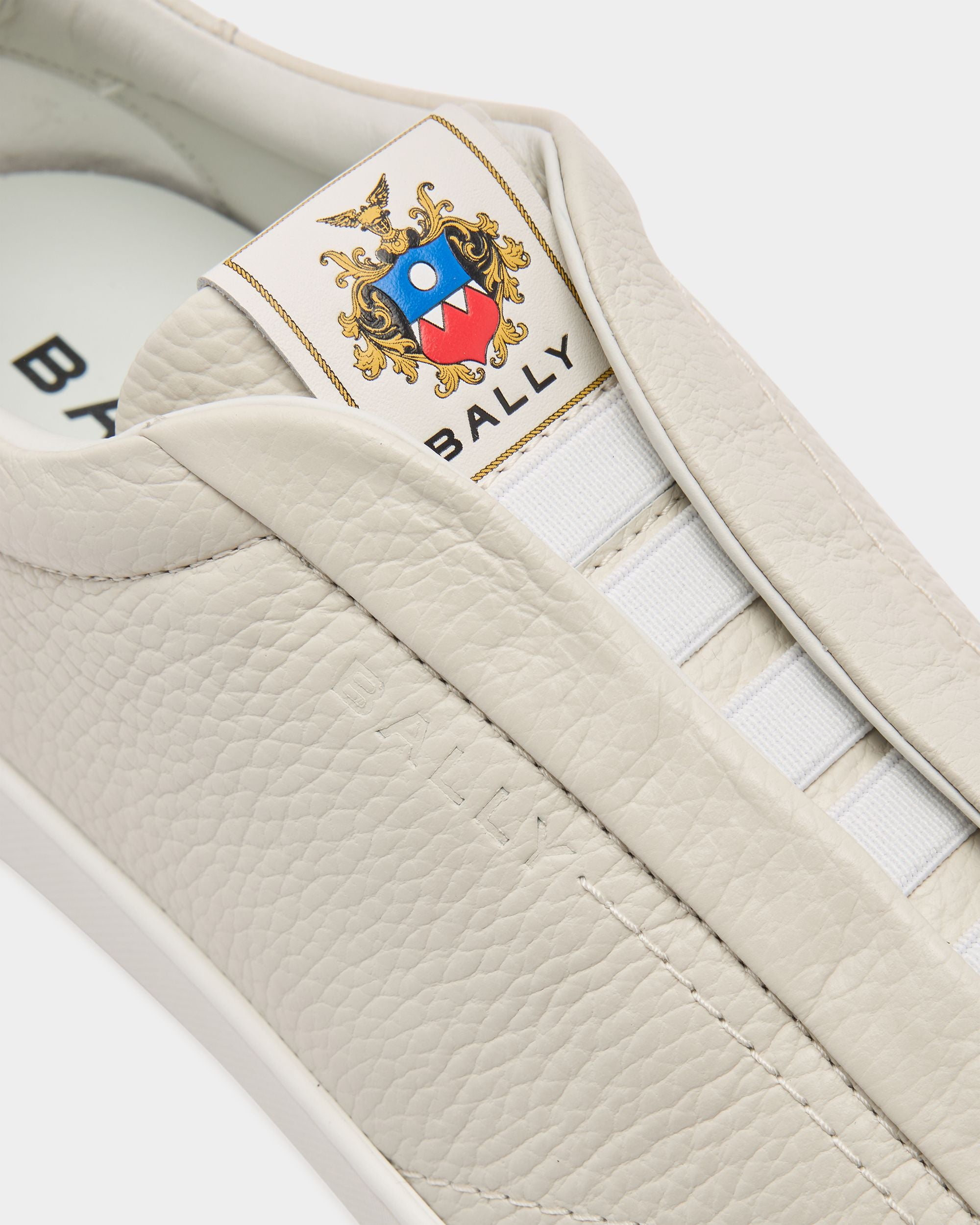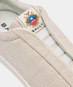 This Retro Crest sneaker in white grained leather is characterized by a sleek slip-on design with tonal elasticated laces set between the minimalist eyestay. A Bally Crest on the tongue and a debossed logo ensure an iconic note.