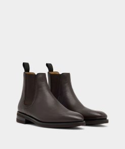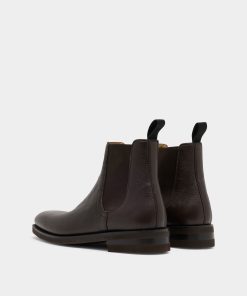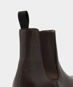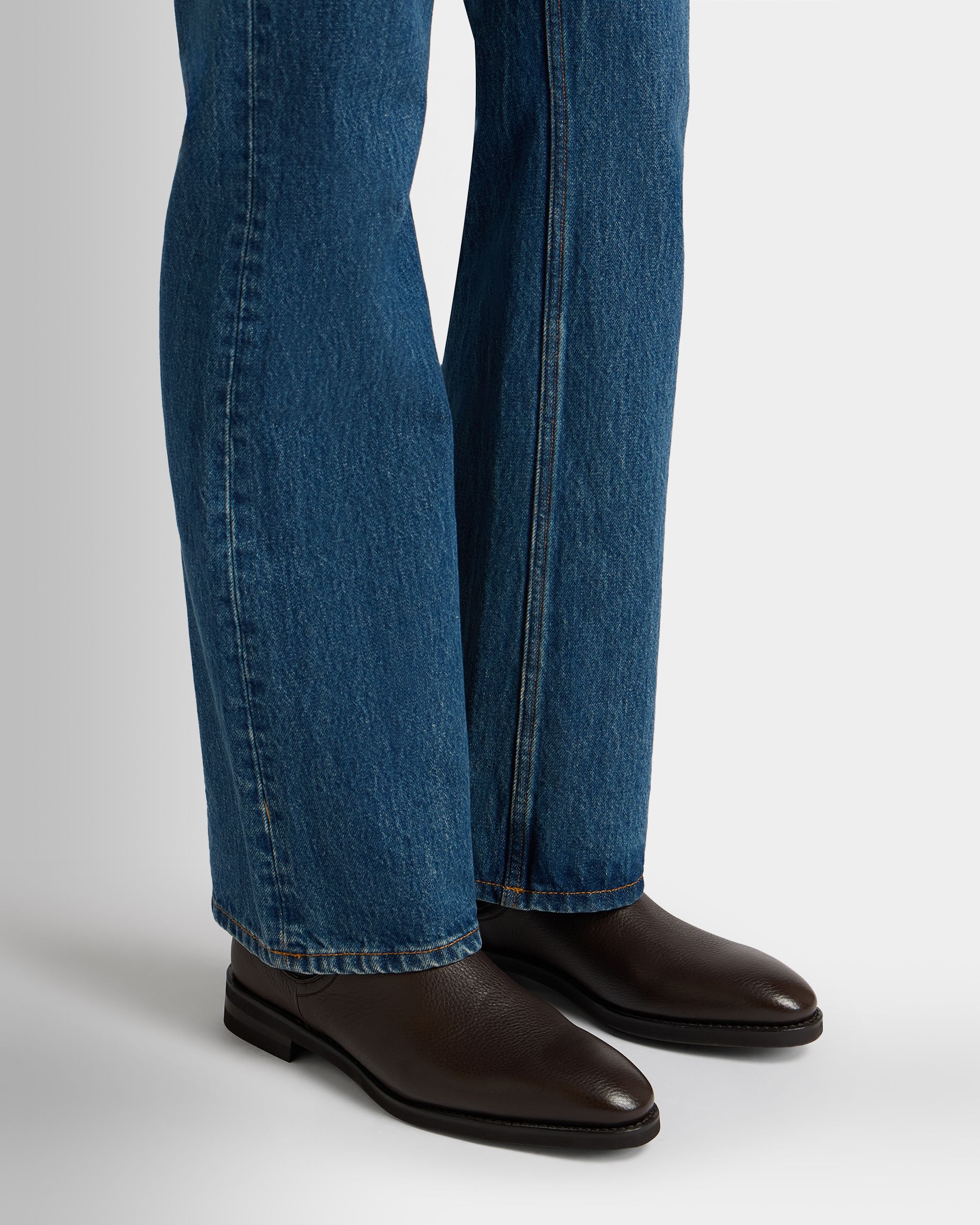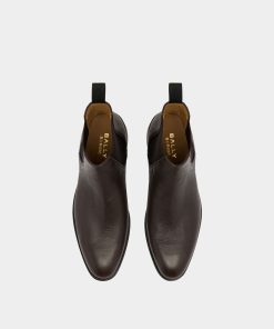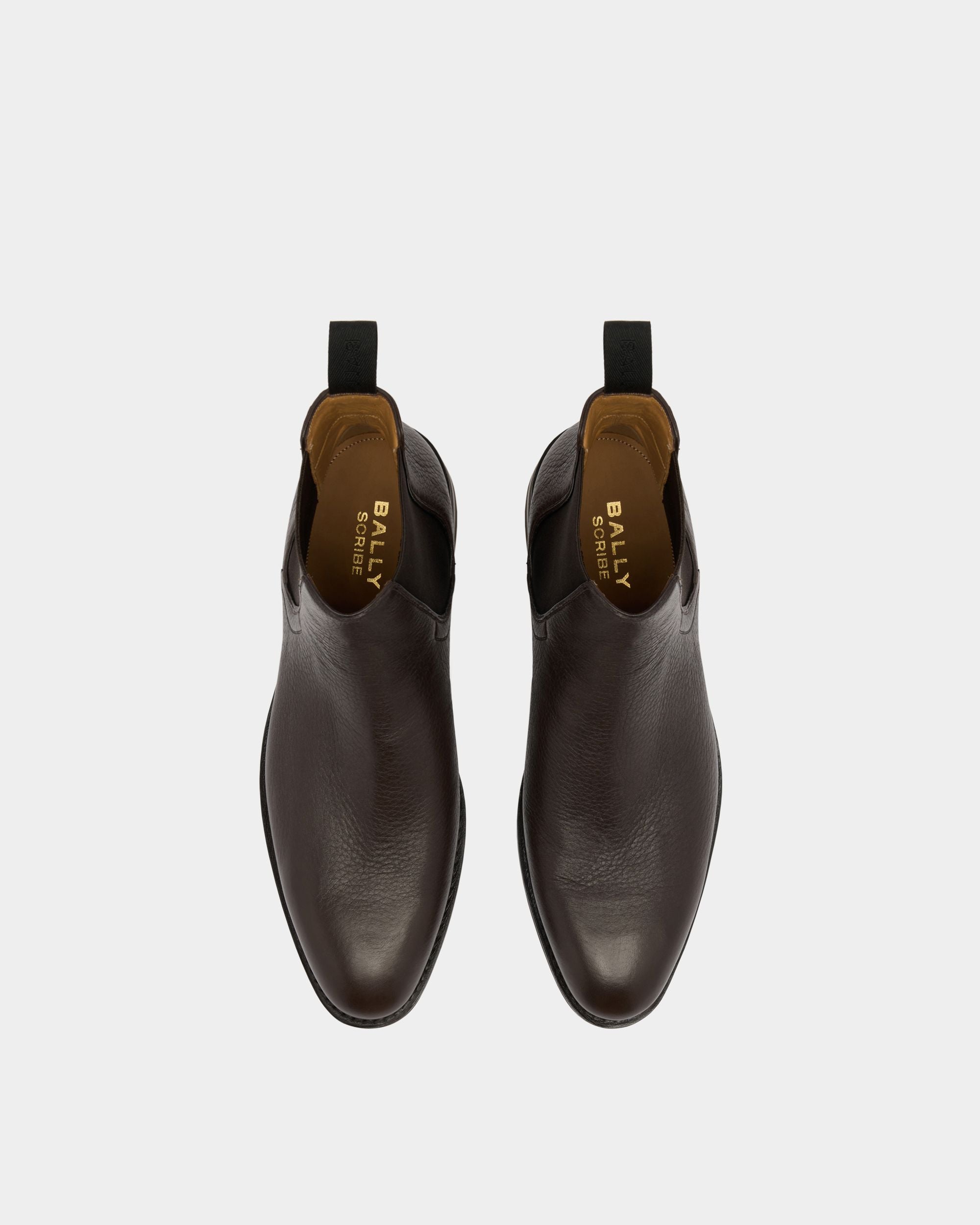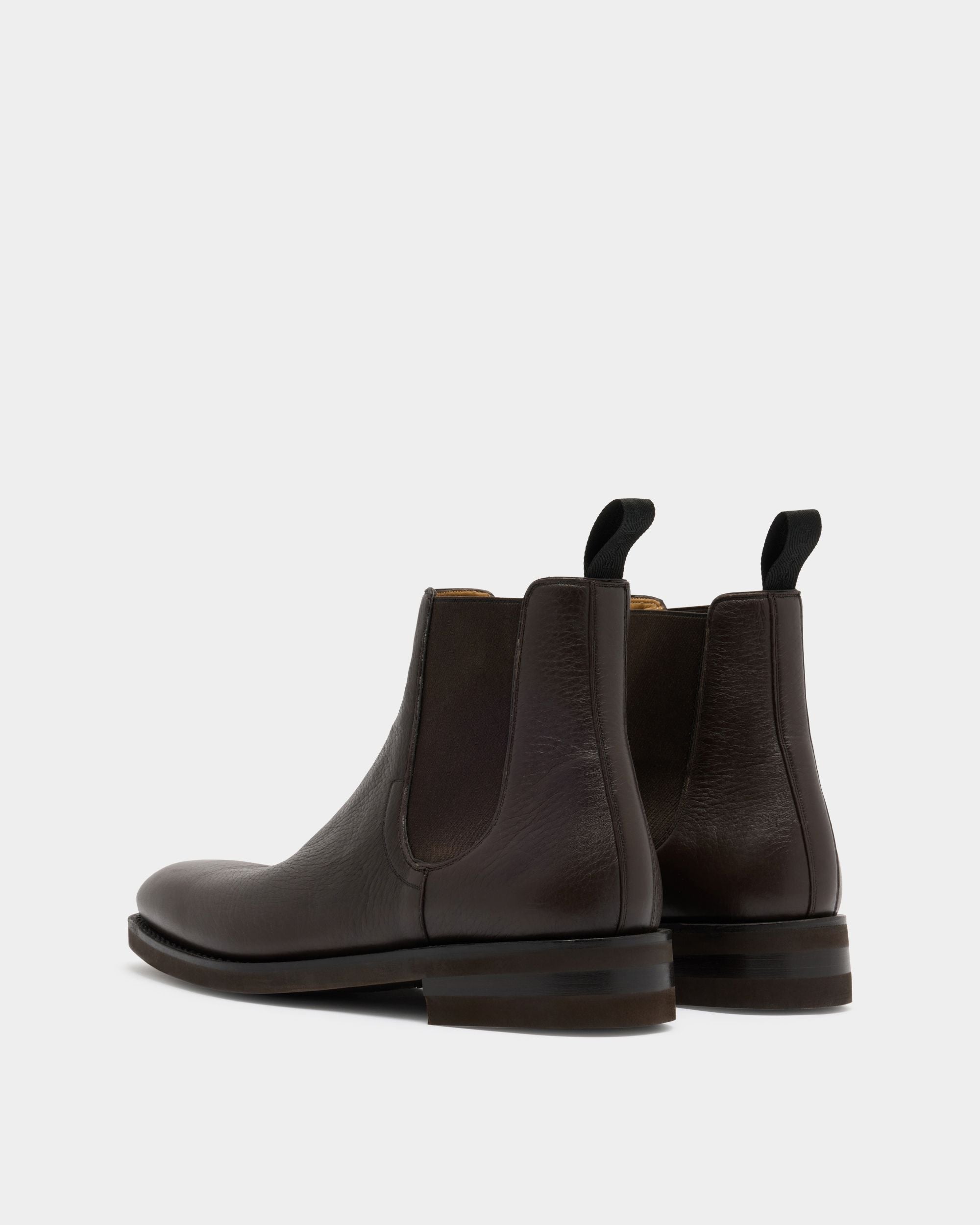 Almond-toe Scribe Un bootie in brown grained buckskin with quintessential elasticated panels and a Bally logo pull tab. Goodyear construction ensures the water resistance of the welted rubber sole on this Chelsea boot.