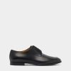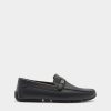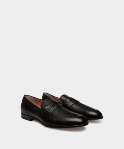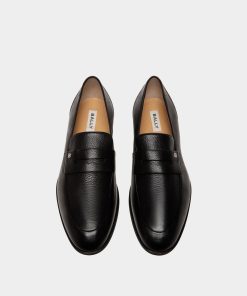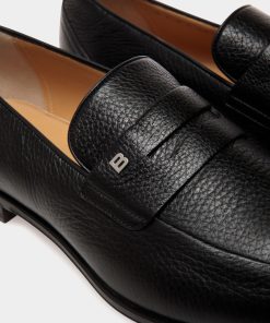 This almond-toe Westminster loafer in black deer leather is characterized by a grained finish, tonal stitching and a saddle strap across the top, embellished with a metal Bally B detail.