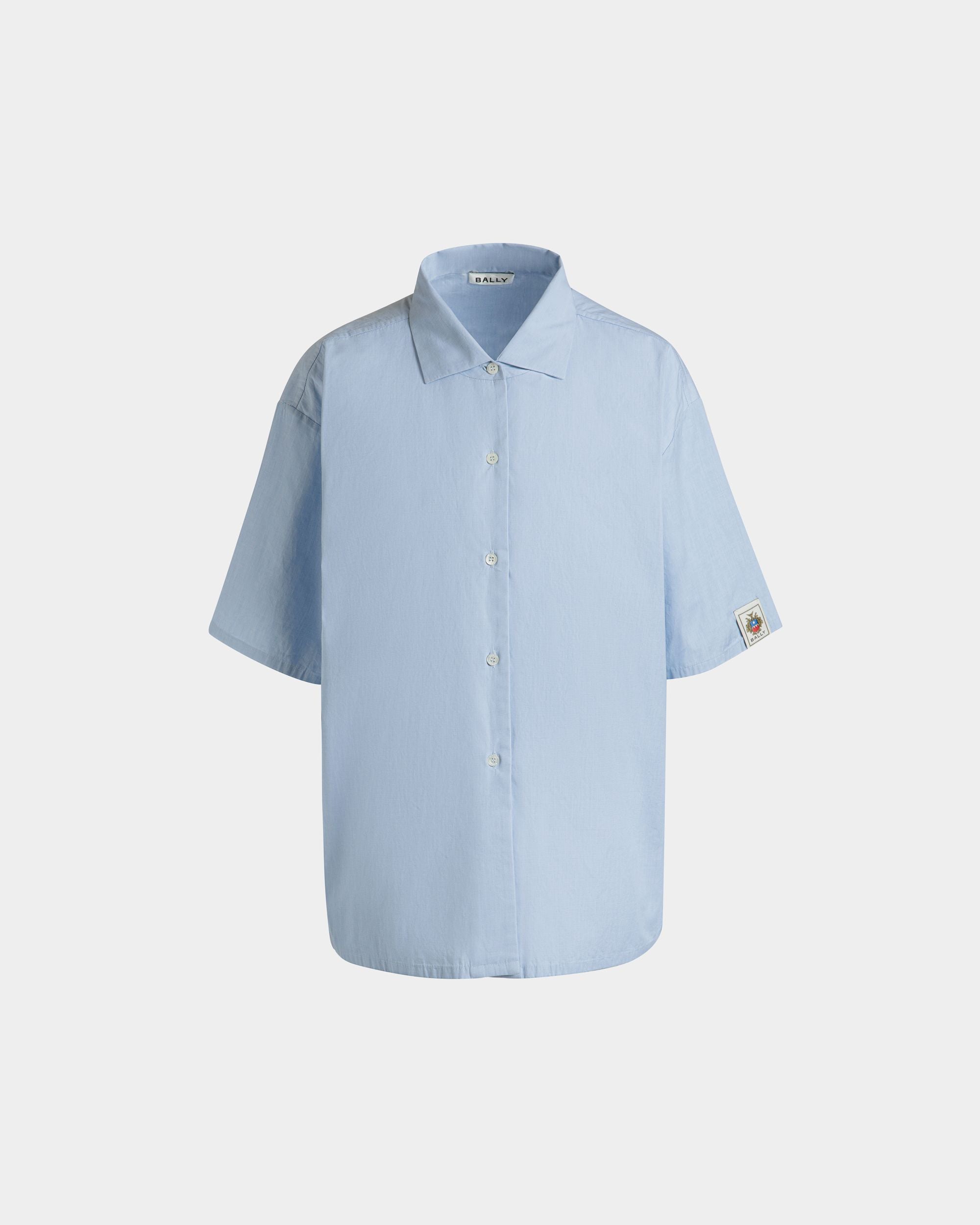 Light blue oversized cotton shirt with a point collar and an embroidered Bally Crest tab on one sleeve. Crafted for comfort and style, a must-have piece for your modern wardrobe.