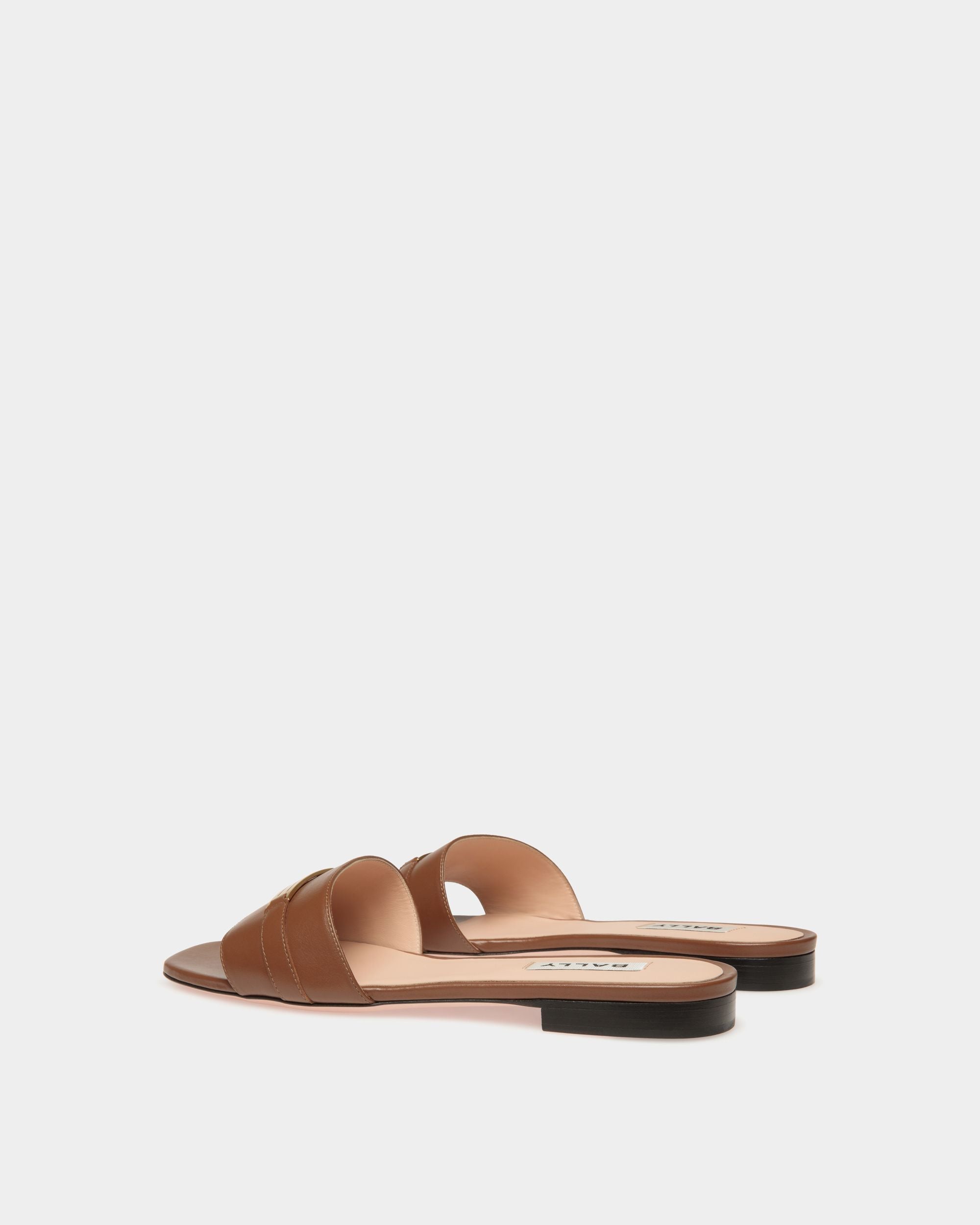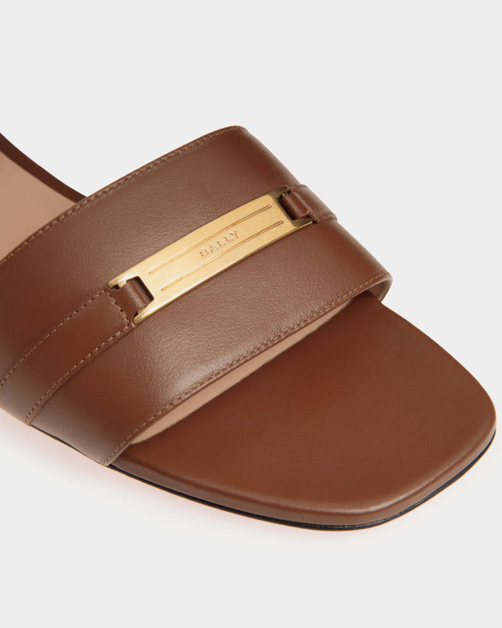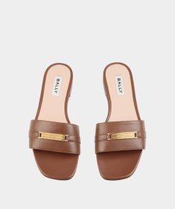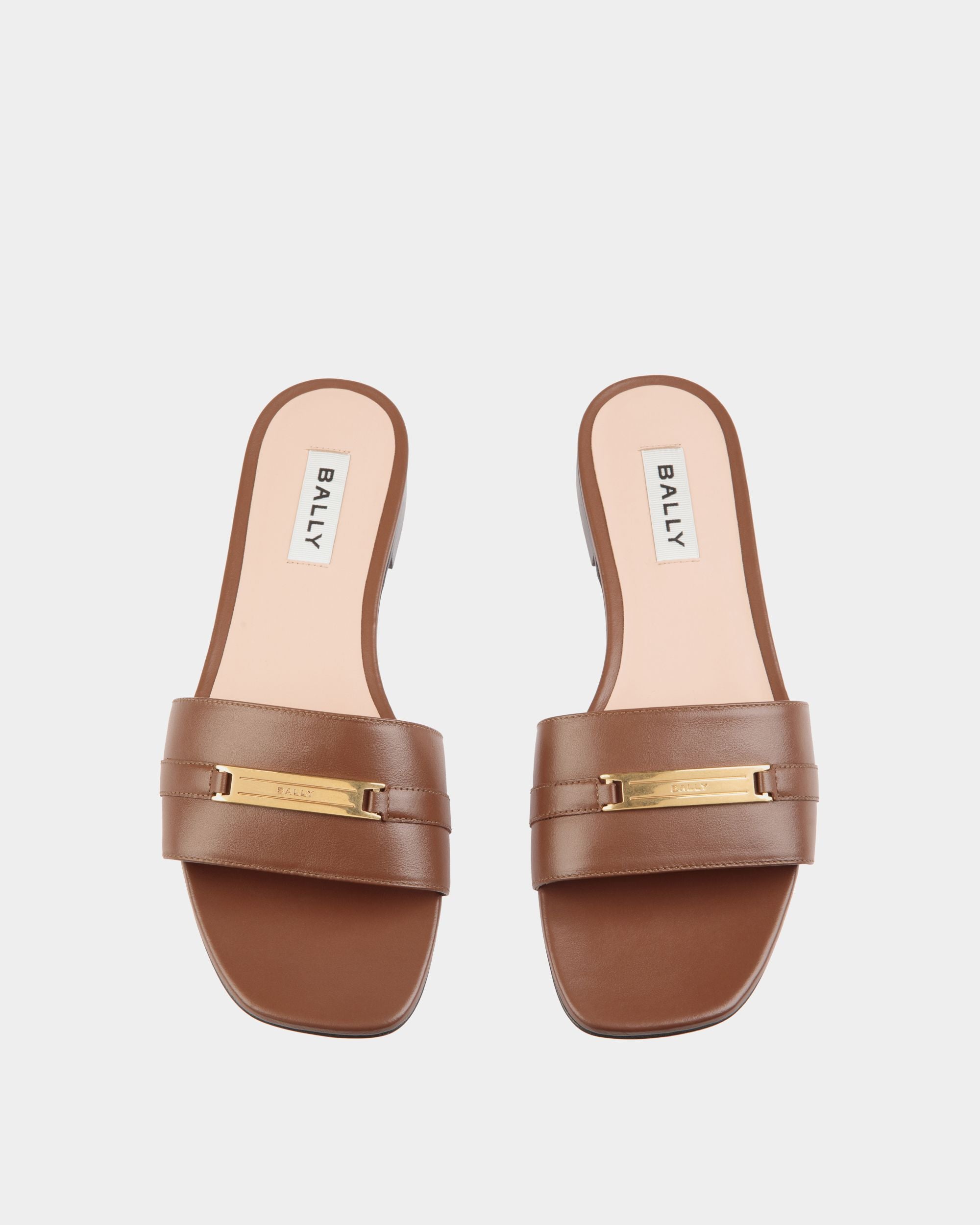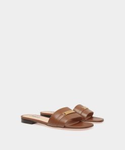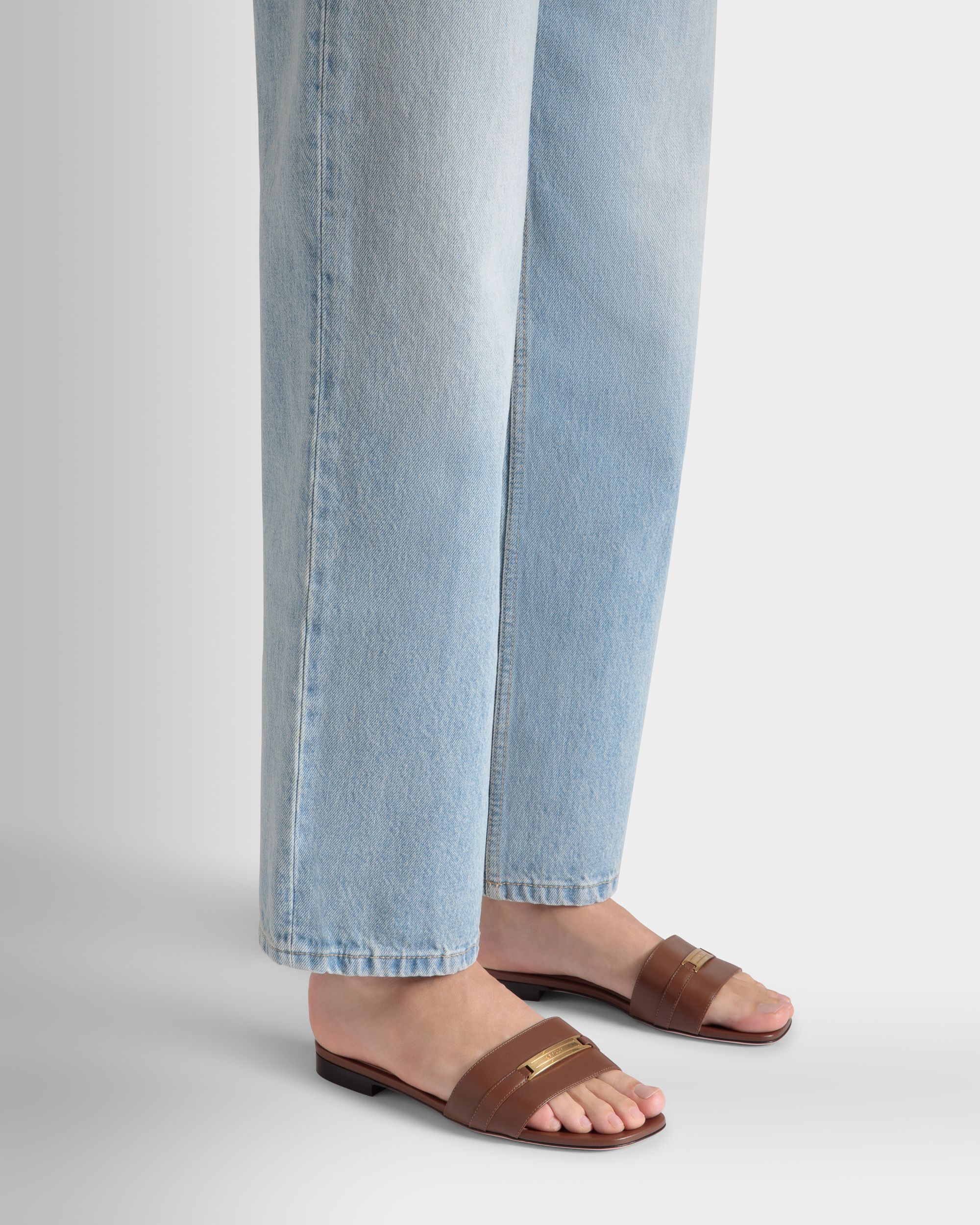 This flat Deco sandal in brown calfskin features a slide upper embellished by a simple metal plaque along the top, a stylistic code which has been reimagined to reflect the Bally Ribbon.