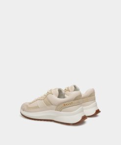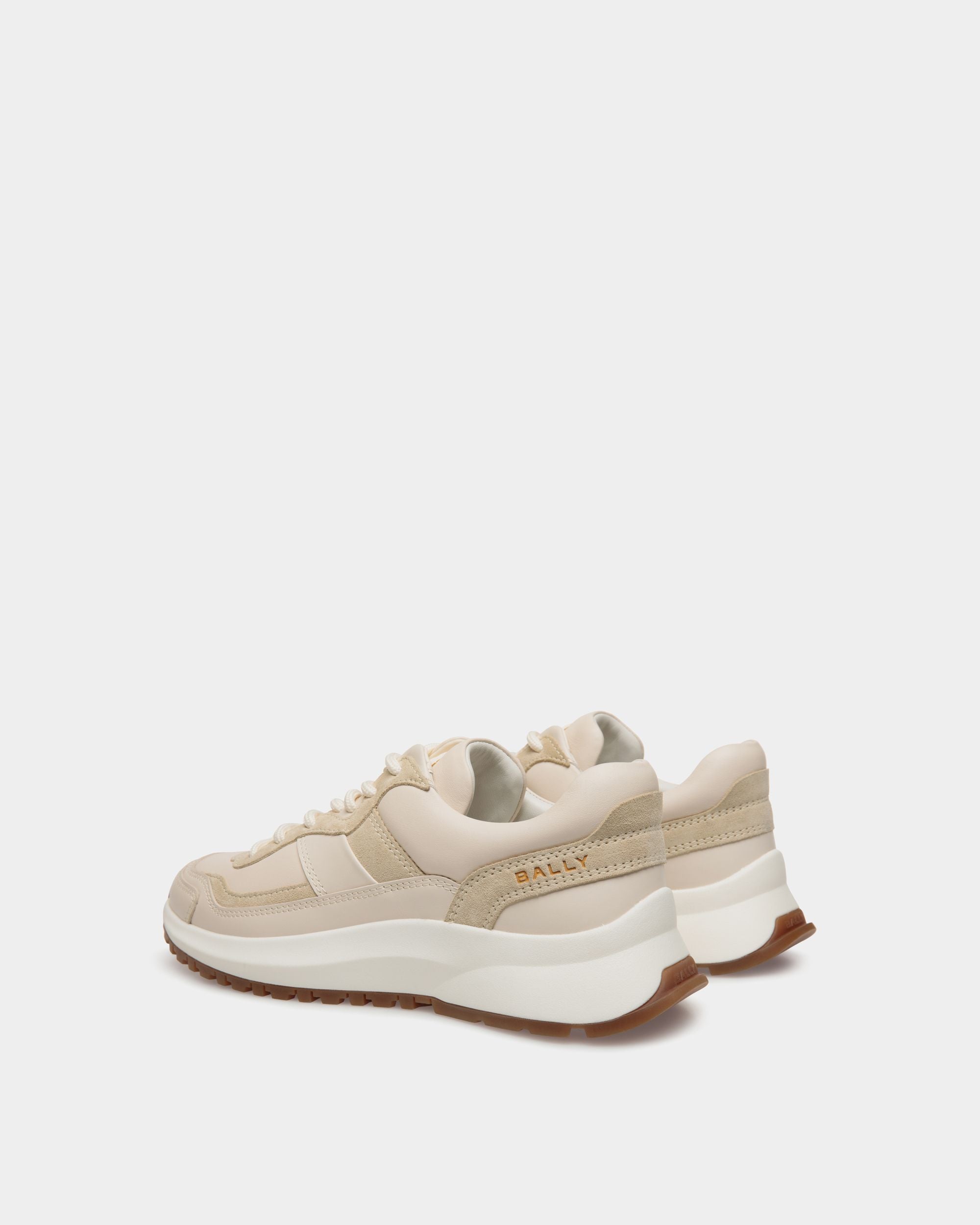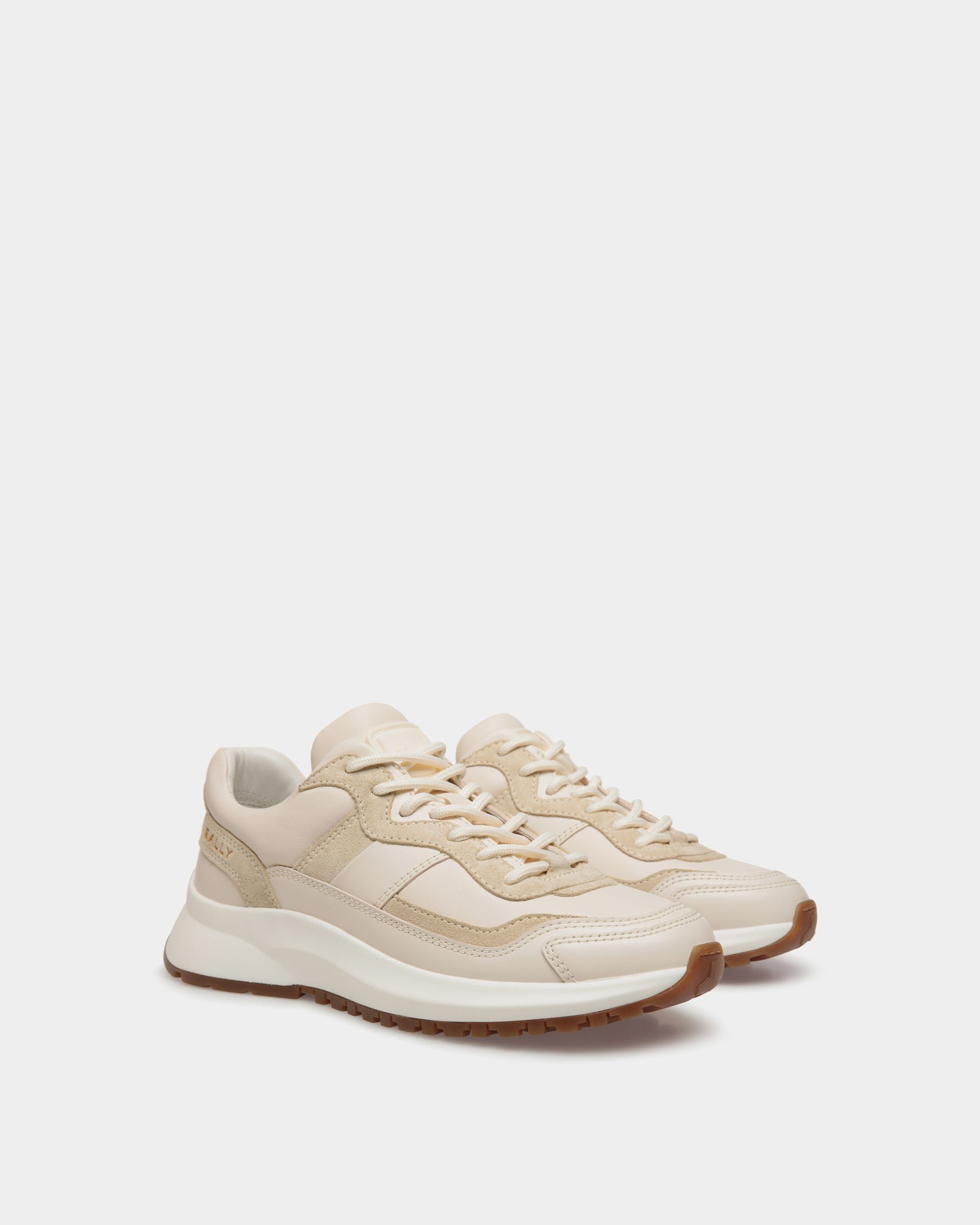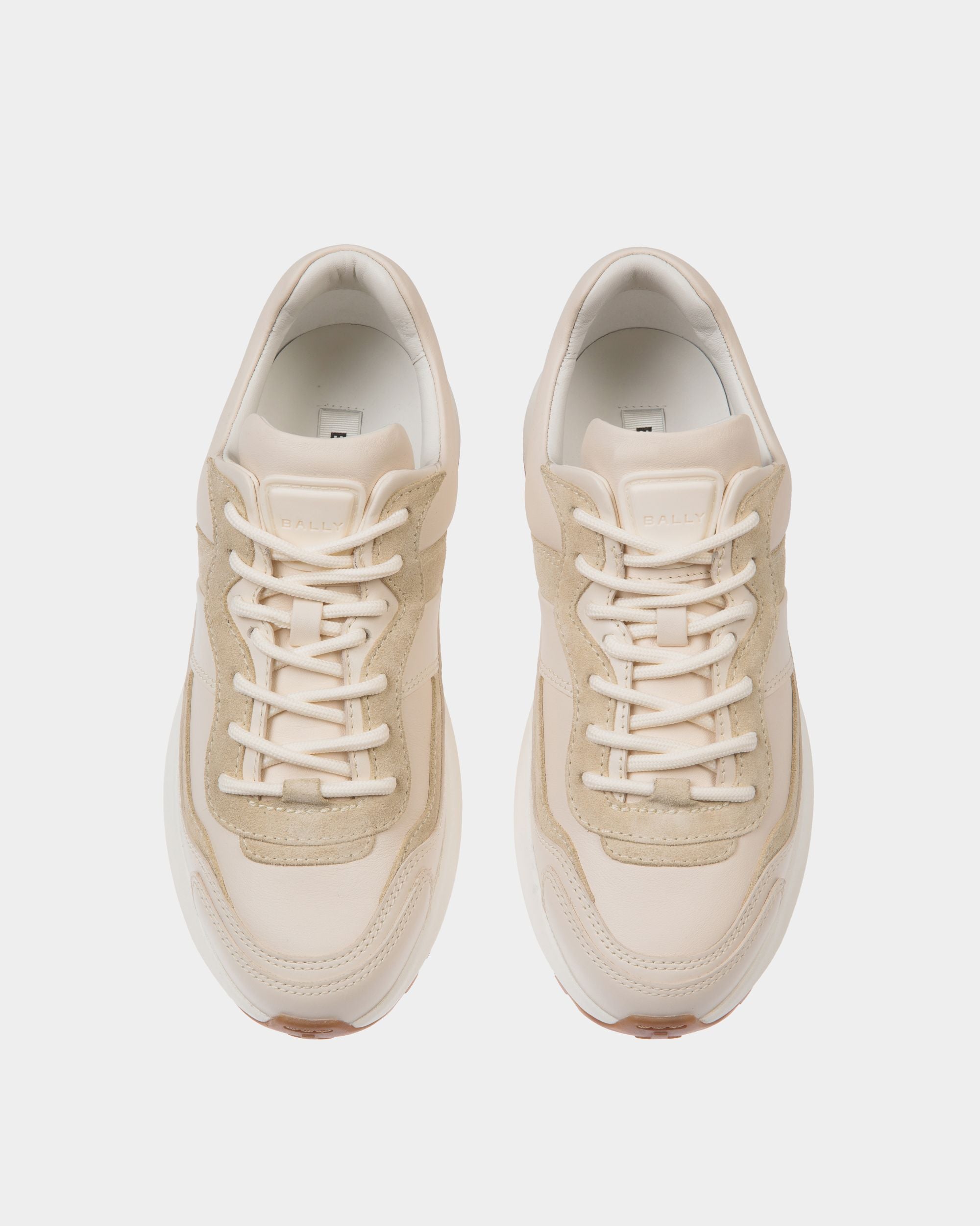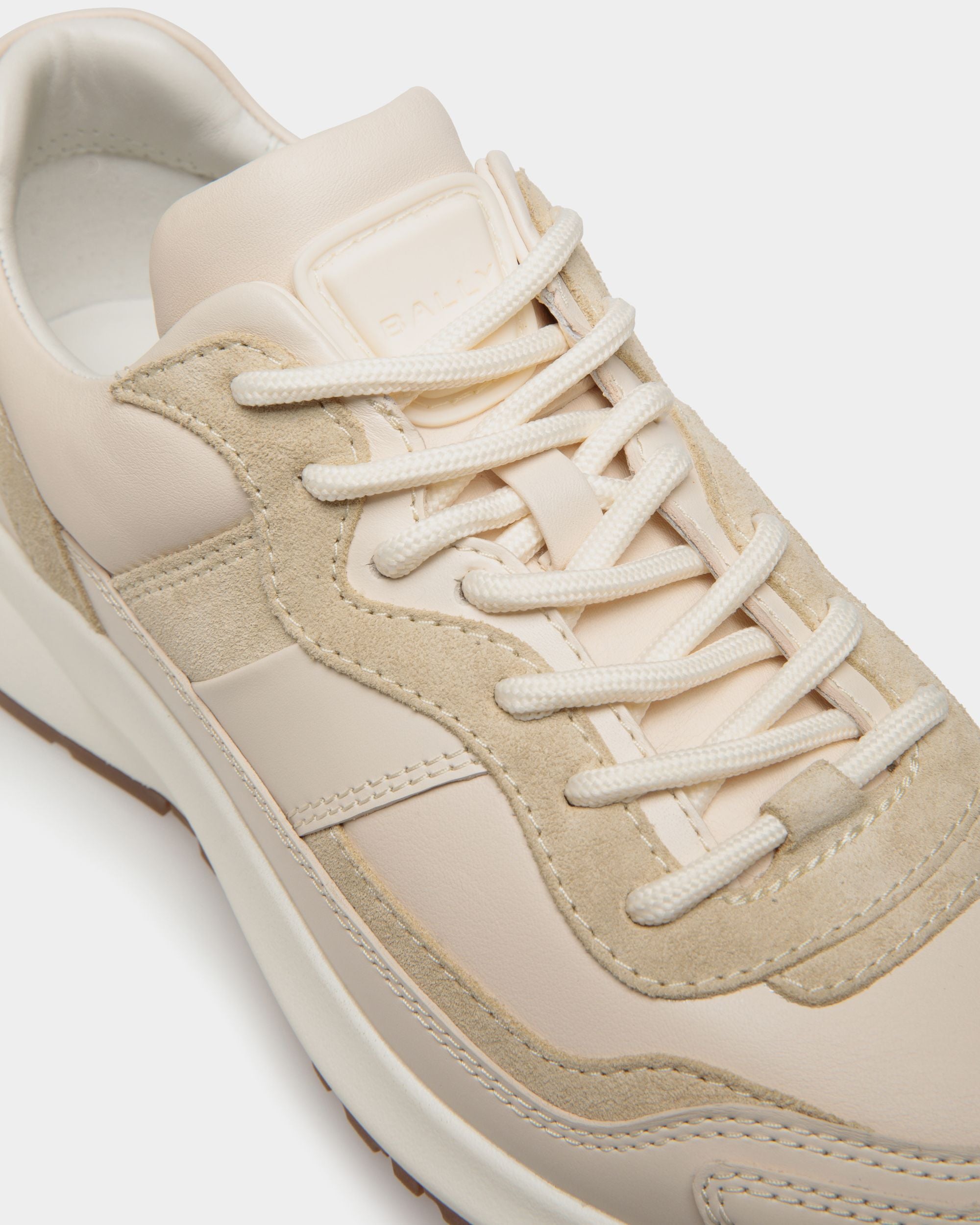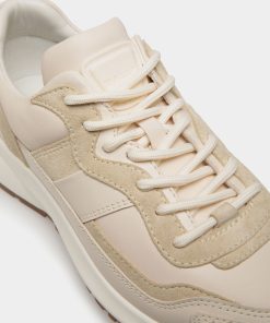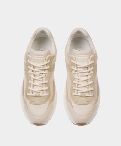 This Outline sneaker has a leather and suede upper in the tones of Ivory and Champagne. Its lace-up design is united with a thick Vibram sole inspired by running styles.