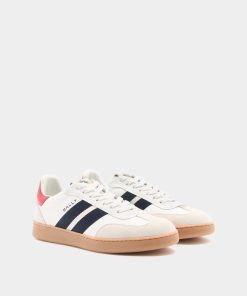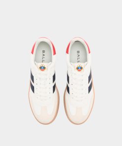 This lace-up Retro Crest sneaker is in white leather with a red and white grosgrain Ribbon to the side. A Bally Crest label decorates the tongue.