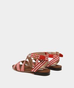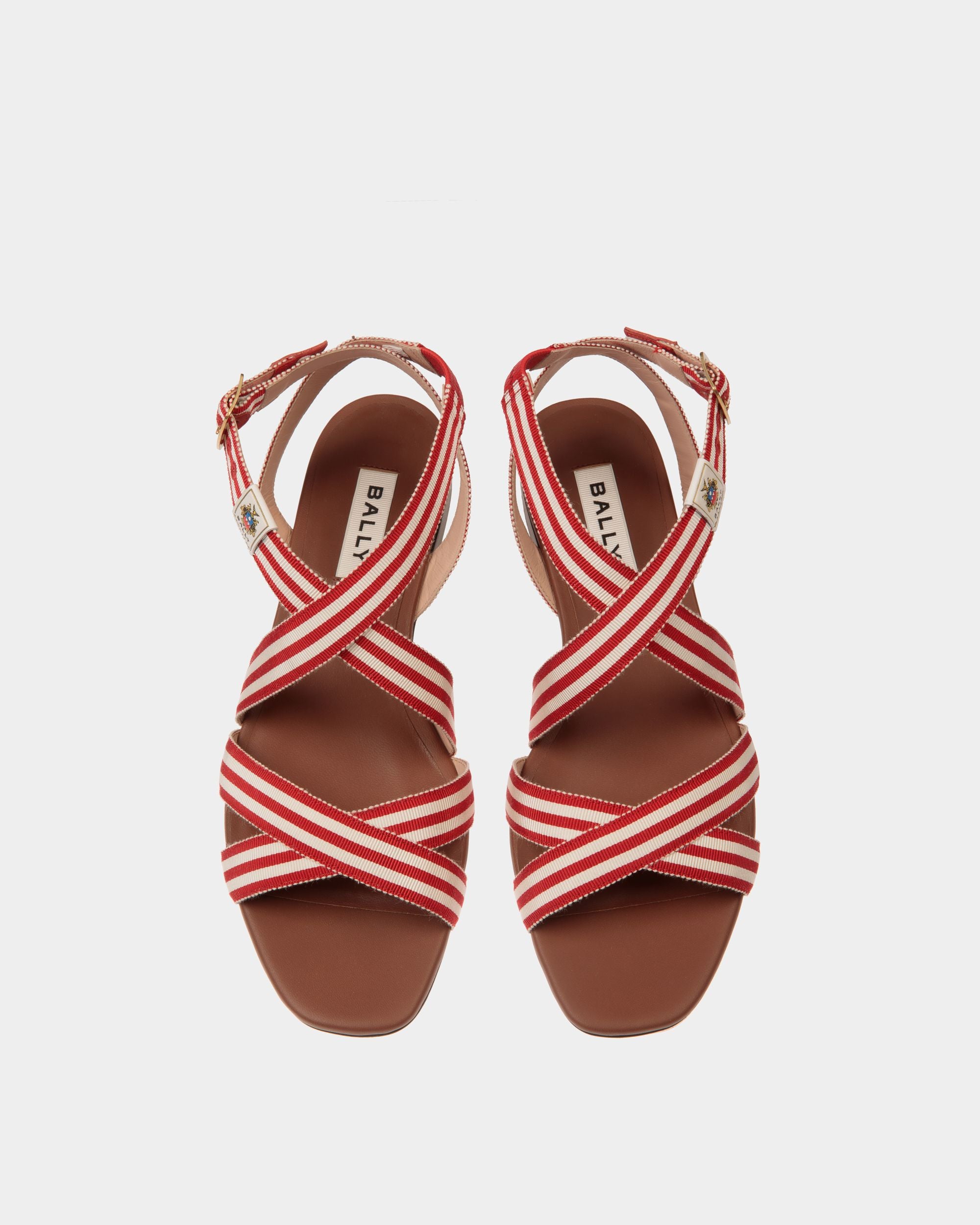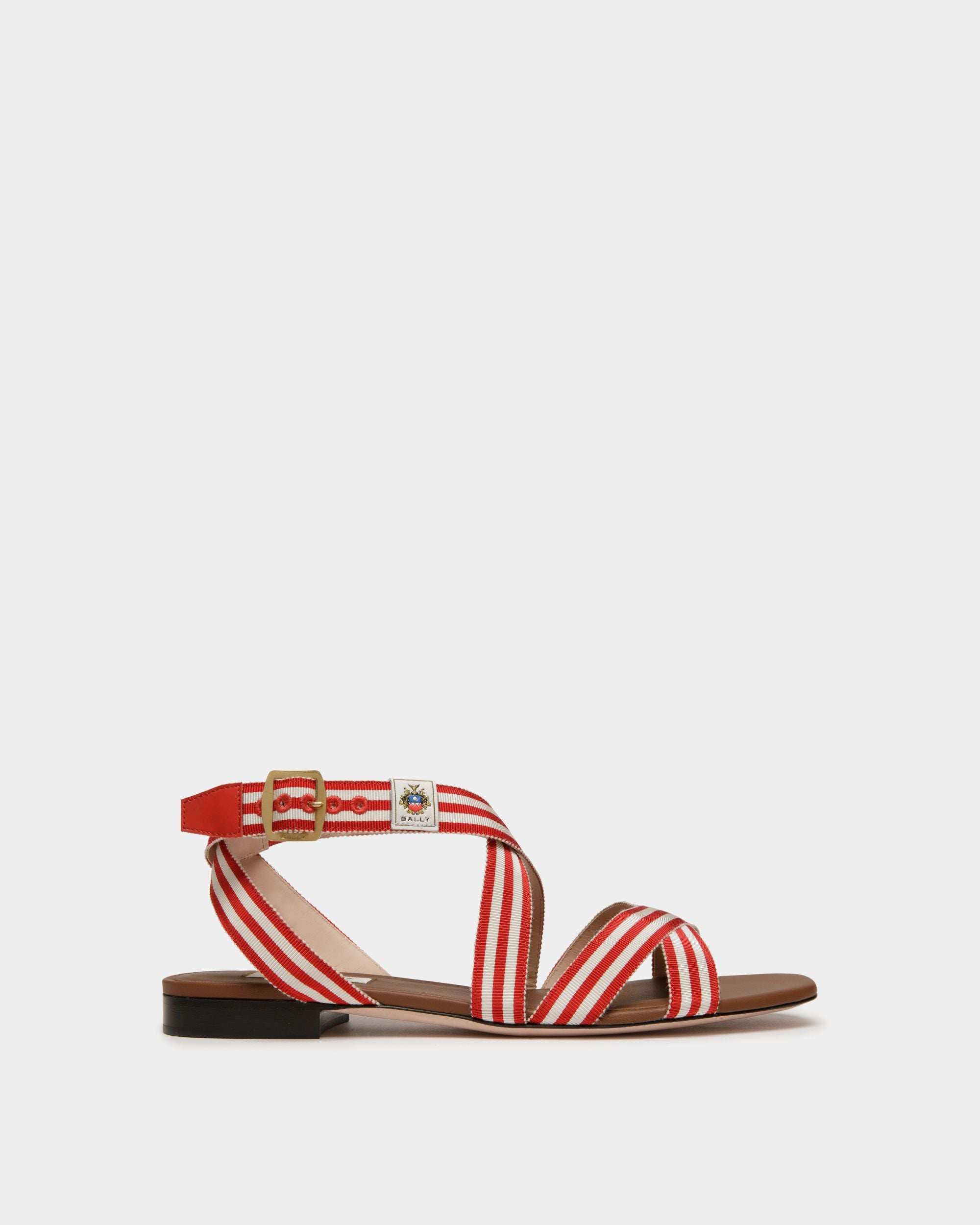 Criss-crossed straps in red and white fabric define the upper of this Sylt flat sandal. A Bally Crest label in leather finishes the ankle strap, positioned to the side of the gold-tone metal buckle.