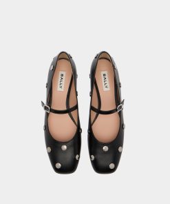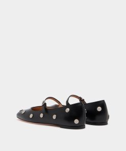 This Ballyrina flat is meticulously crafted in black calfskin with round flat studs which create playful yet bold polka dots. A slender strap crosses the top, secured by a metal buckle inspired by a design from the Bally archives.
