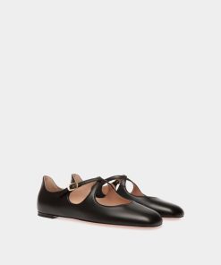 With slender criss-cross straps to the top, this Ballyrina is crafted from supple black lambskin. Inspired by an original Bally design from the 1940s, it reimagines a classic square-toe ballet flat with a modern twist.