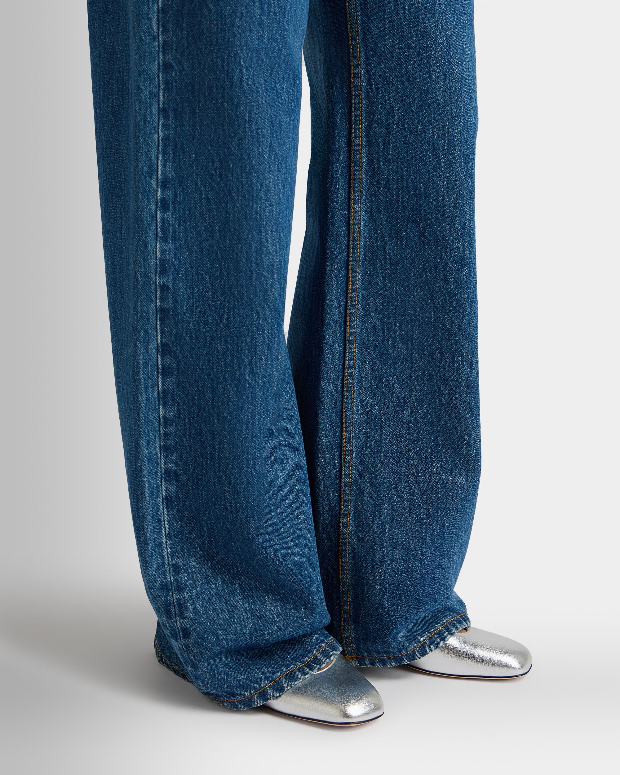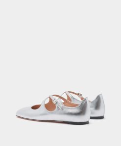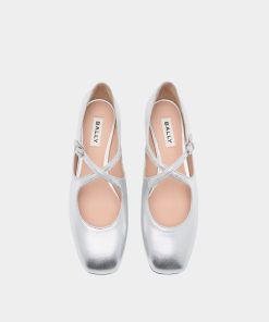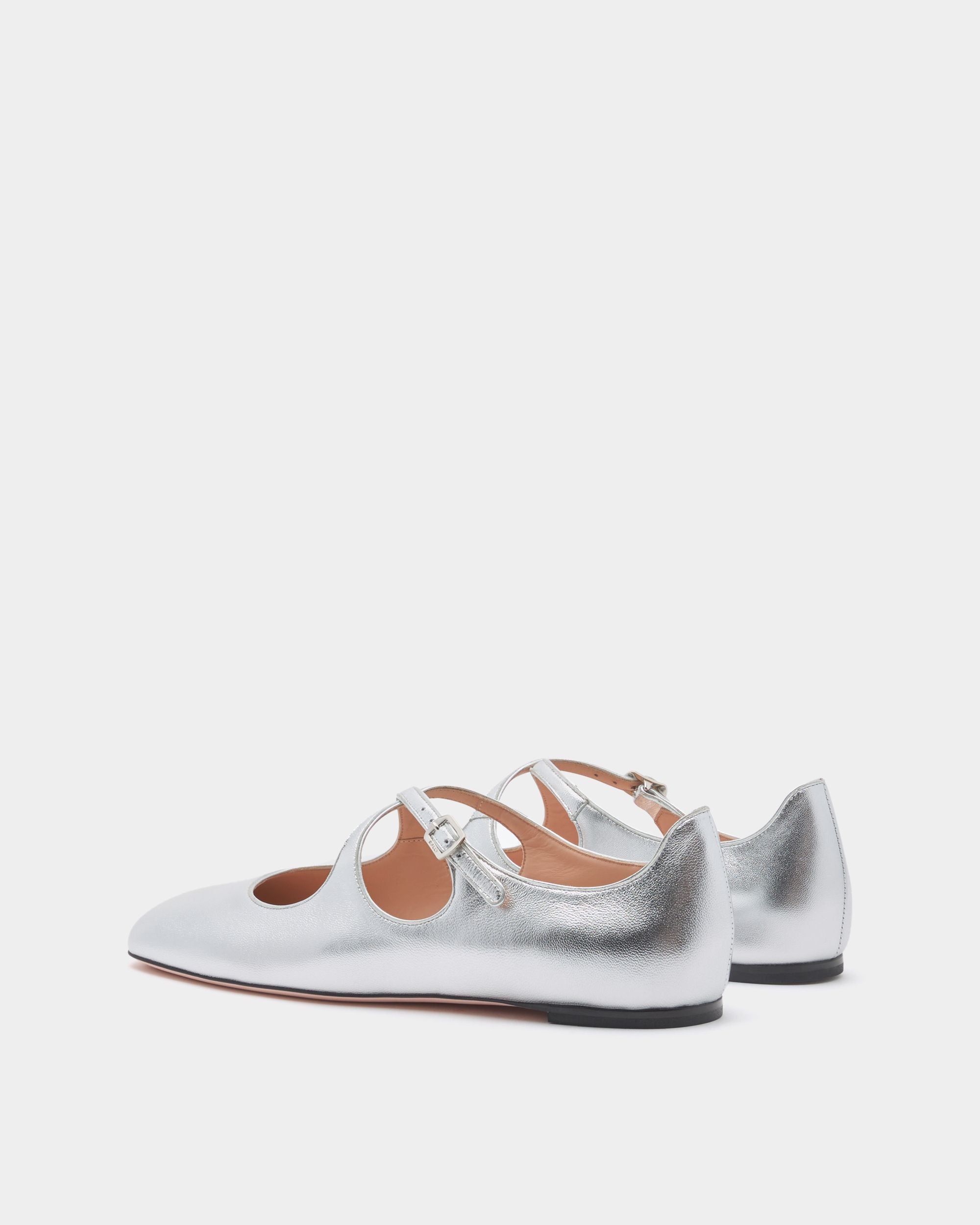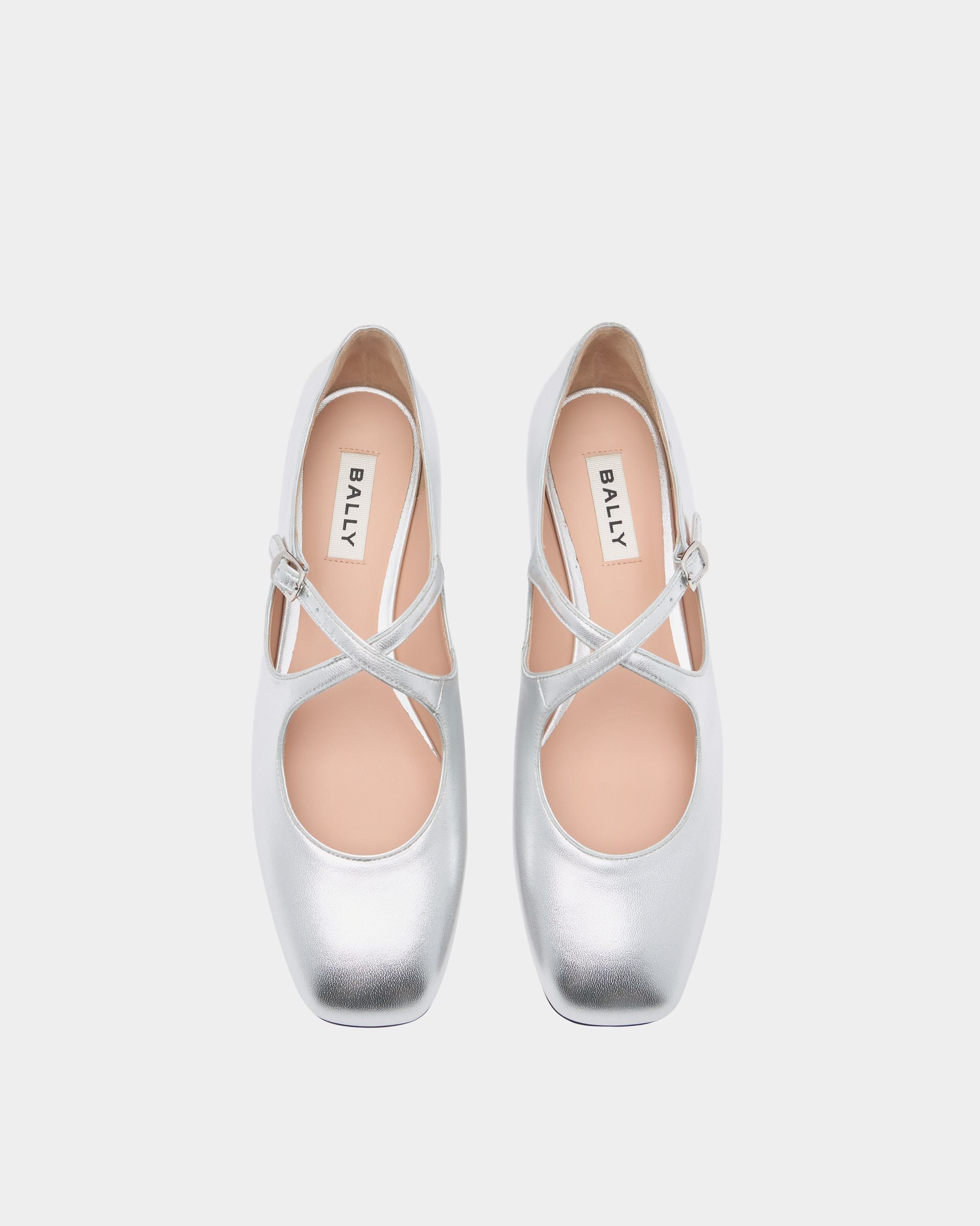 This Ballyrina flat is meticulously crafted in soft sheepskin with a silver finish. Two slender straps cross at the top, secured by a metal buckle inspired by a detail from the Bally archives. A square toe provides an on-point finish.